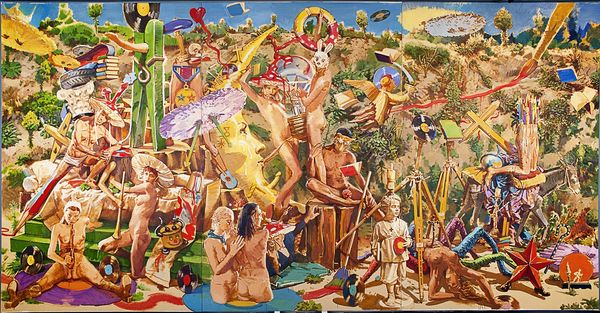 Arsen Savadov made *To Maria Priymachenko* using paint, layering fantastical creatures and people in a strange landscape, like a dream unfolding before us. The making of art is a process, and here, it feels like Savadov is letting his subconscious lead the way. There's so much to look at, but let’s zoom in on the lower part of the painting, where a blue quadruped, dotted with white spots, seems to prance through the scene. The paint is applied in thin washes, creating a textured surface that feels both delicate and otherworldly. The animal is a creature of fantasy but it's somehow very grounded in this painterly world. Savadov's work reminds me a bit of the Surrealists, who were also interested in exploring the unconscious through art. But Savadov brings his unique vision to the table, creating a world that is all his own, a world that embraces ambiguity and multiple interpretations, much like life itself.