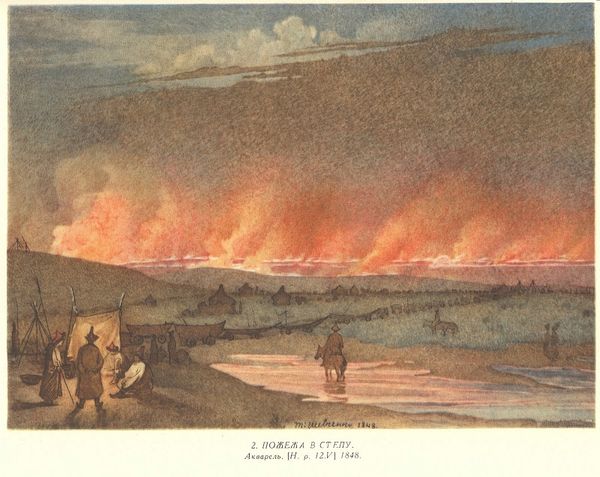 Curator: Look at this dramatic scene. It’s Charles Burchfield's "Pyramid of Fire," executed in 1929 with watercolor. It's like witnessing a moment suspended in time. What’s your first take? Editor: Visually chaotic, isn't it? The frantic energy! The layering of the watercolor gives the fire such volume. The textures feel rough, almost tangible like you could feel the heat emanating from it. Curator: The pyramid shape is important here, isn’t it? It alludes to destruction but also a terrible beauty, perhaps referencing ancient funeral pyres or cataclysmic events rendered across time. The symbolic weight! Burchfield frequently uses such geometries to express hidden cosmic order, even in the face of chaos. Editor: The limited color palette really emphasizes that chaotic element though, don't you think? Browns and muted reds everywhere. And that sharp contrast between the darker foreground figures against the brightness of the conflagration pulls your eye straight to the destructive element. Almost Baroque. Curator: Precisely. The silhouettes of the spectators, anonymous and vaguely terrified, amplify that idea, speaking to a shared experience and cultural memory around loss and disaster. Burchfield captures more than just a literal fire; it’s about community trauma. The almost folk-art handling lends to that sense of communal experience, wouldn't you agree? Editor: I do. The flat application, visible strokes, it lends a somewhat naïve look— though the intentional composition completely undercuts the notion. Burchfield wields that perceived naivety to lure the viewer into this dramatic composition, drawing us towards the blazing structure at its heart. Curator: These paintings mark an evolution for Burchfield. He was fascinated by portraying raw human emotions within natural forms; this transition feels almost cathartic, capturing these sentiments directly onto paper through such dramatic scenes. Editor: Indeed. Analyzing the use of such limited form creates the real depth; despite a chaotic theme, it gives it structural simplicity that is so clever and makes it engaging. Curator: Seeing beyond simple appearances really does open doors to a whole universe of meaning doesn’t it? It shows that art holds layers of history waiting to be unearthed! Editor: I agree. It just reveals the careful craft behind that rawness—how much that heightens emotional experience for us as observers.