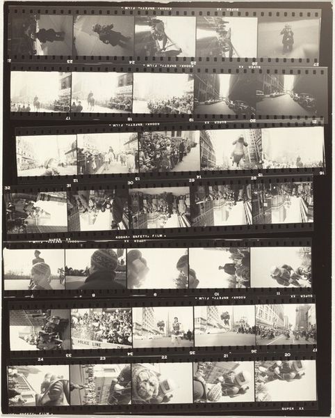 Curator: This is Robert Frank's "Guggenheim 410--Los Angeles," a gelatin-silver print from 1955-56. The work is actually a contact sheet presenting a sequence of images from his travels across the United States, later becoming part of his book "The Americans." Editor: The sheer quantity of images—a whole journey compressed onto one surface—is the first thing I notice. There's a nervous energy; a feeling of rapid documentation that both intrigues and slightly overwhelms. Curator: Absolutely. Frank was seeking to capture the complexities of American society. What might seem like disconnected snapshots actually reveal societal dynamics and the individual experience within those larger systems. This presentation makes me consider W.E.B. Du Bois's concept of double consciousness in Black Americans – always aware of how one is seen, not just how one sees oneself. These fleeting glimpses speak to that divided self. Editor: It’s the light that captivates me – harsh contrasts rendering palms trees almost ghostly. Palms often function as symbols for paradise and relaxation but are captured with a certain bleakness here. Could it be a reference to something that appears desirable but may hold internal dissonance or latent suffering? Curator: Precisely, there's a tension created between the iconic symbolism of Los Angeles – the palms, sunshine – and the grainy, somewhat unsettling presentation. It complicates the narrative of the 'American Dream,' showing fractures and alienation that weren’t typically acknowledged in mainstream media at the time. His focus moves us away from glamour to real life on the streets. Editor: I think you are right, Robert Frank is showing us something deeper than a picture postcard view. Seeing several images in a sequence really gets to the way we form memories as well. There is the perfect shot of the perfect palm tree, and yet we recall moments, rather than perfection, in sequences. What appears broken somehow reveals our cultural patterns of seeing. Curator: And by extension, perhaps our shared understanding that reality rarely lives up to the idealized images we are fed. I find the framing devices in the images and as an object itself equally striking as they help shape our perceptions of each moment, which I read as inherently political. Editor: An important detail indeed. These fractured images of familiar symbols feel almost like pieces of memory to rearrange at our will. It’s this disruption that causes new questions to the front. Curator: Frank's piece challenges the romanticized notions of American identity prevalent during that period and offers a critical, yet empathetic, view. Editor: It’s that ambiguity, that ability to hold multiple perspectives, that makes the image resonate even today, for me.