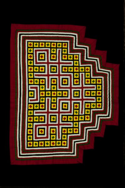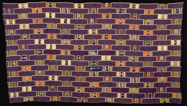 Curator: The geometric designs immediately strike the eye—it's incredibly vibrant. Editor: Indeed! We are looking at an Ewe textile entitled "Wrap," dating back to the 20th century. The cotton weaving is currently held at the Minneapolis Institute of Art. Curator: As a textile, the 'Wrap' occupies a critical position as more than a practical object, it's also a statement piece, functioning to define both individuality and belonging. How would you evaluate the significance of this relationship between social performance and this cotton cloth? Editor: From a material perspective, the processes involved, from cotton cultivation to the weaving and dying of the cloth, represent a fusion of artistic and labour practices deeply embedded in community economies. Curator: Right, the intricate weaving reflects sophisticated artistic traditions and encodes specific cultural meanings. The pattern acts as a complex social script to consider its wearers' position, origin, and beliefs. We could think of the process of crafting such a garment, particularly by women, as a process of actively re-articulating societal norms. Editor: Precisely! Also, considering the means of production allows us to understand value beyond pure aesthetics. Labor transforms raw material into an object imbued with significance. The combination of different materials available, the choices in dyeing—they all contribute to a textile's potential consumption value. Curator: Consumption itself plays a crucial role—not only materially, but as a form of performative action. These fabrics historically facilitated a narrative between identity and agency and highlight broader debates concerning colonization, globalization, and power dynamics. Editor: Yes, understanding the cloth’s manufacture reveals social structures, reinforcing the value created at each stage. Its geometric nature and abstraction suggest to me an interaction of artistic integrity coupled with a clear intention of commodity purpose. Curator: Thinking about these combined values enriches our interpretations—prompting us to acknowledge labor while engaging with its social implications and artistic language. Editor: It’s this dialogue between art and everyday utility that makes analyzing such an item very compelling. Curator: Absolutely. And considering textiles in the art historical context really brings up key conversations about power and cultural production. Editor: I agree—studying "Wrap" has provided me with another opportunity to connect art with daily lives while emphasizing tangible connections, which always leads to something new!
