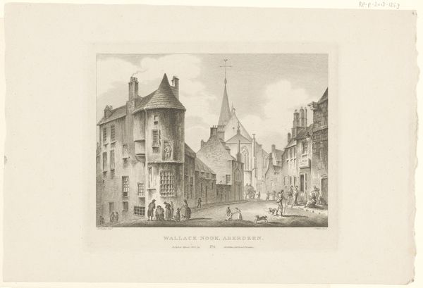 Editor: This is "Gezicht op het Pesthuis en Sint-Elisabethgasthuis te Alkmaar" by Leonard Schenk, created sometime between 1736 and 1746. It's an engraving, a cityscape. There's something very ordered and serene about the way the buildings and figures are placed; it gives off a feeling of calm, almost detachment. How do you interpret this work? Curator: The detachment you feel is palpable. Consider the dual function indicated in its title and inscription. “Pesthuis” refers to a plague house, and "Sint-Elisabethgasthuis" a hospital. While the figures seem peacefully coexisting in the streetscape, the image evokes complex memories of disease and care. Notice the church-like structure; it’s visually imposing. Religious symbolism would likely have provided a strong psychological support during times of plague, wouldn't you agree? Editor: That's a good point! It is easy to look at the image and only see the serenity of a historic street view and to gloss over how places for sickness and healing were actually central parts of the town's activity. Do you think that it makes any statements about attitudes towards sickness or towards faith? Curator: Attitudes toward sickness were obviously quite different. The plague was understood as a punishment or test, but note how integrated it is within the visual framework. It reflects, perhaps, the normalization of death. Churches and hospitals – sacred and secular healing – existing in symbiotic tension. Perhaps faith isn’t simply hope but social architecture within times of turmoil. What do you take away from this new view? Editor: I see what you mean; there’s almost a stoic acceptance embedded in its placid representation, that the architecture of faith and medicine represent an attempt to exert some social control when the plague felt so out of control. Curator: Precisely. This visual record now holds many layers of memory.