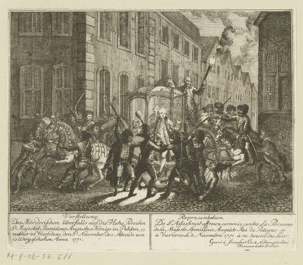 Curator: Jacques Callot created this etching, entitled "Prodigal Son Is Ruined," sometime before his death in 1635. It's remarkably small, only about 6 by 8 centimeters. Editor: It feels like absolute chaos contained in a tiny box! There's so much energy; figures are spilling out of windows and doorways. The architectural precision contrasts brilliantly with the wild scene unfolding. Curator: Indeed. Callot's mastery is evident in the way he uses line to create depth and texture, observe the use of hatching. The composition draws your eye to the central figure, presumably the prodigal son himself, amidst the mayhem. Editor: He’s the focal point for sure—the target of all that ridicule. It’s a brutal, almost farcical depiction of moral decline, isn't it? Curator: Precisely. The narrative is conveyed through meticulously rendered details, reflecting the social commentary prevalent in the period. Editor: It leaves you pondering the fleeting nature of fortune and the swiftness of societal judgment. The whole thing is just so lively! Curator: A perfect encapsulation of a cautionary tale. Editor: I see it more as a reflection on human foibles and the enduring spectacle of misfortune.