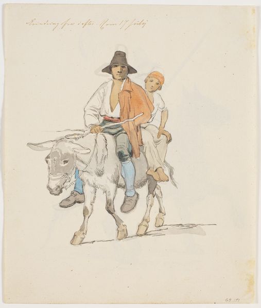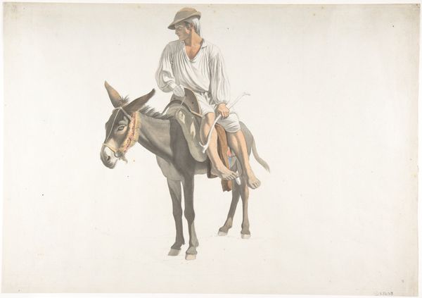 Johan Thomas Lundbye created this drawing, "Æselrytter set skråt bagfra", with pen and watercolor in 1845. The work presents a man riding a donkey, viewed from an oblique rear angle. There is a pale, muted palette dominated by blues, grays, and subtle earth tones. The texture is delicate, defined by fine lines and translucent washes of color. The composition emphasizes the interplay between form and space, with the figures placed centrally against a light background. Lundbye uses line to define the contours of the figures, creating a sense of volume and depth. The rider's form, constrained by bright blue and red lines, contrasts with the donkey’s gray body. The rider's gaze is hidden, inviting a semiotic reading of anonymity and a challenge to traditional portraiture. Note the use of light and shadow to model the donkey's body, highlighting its musculature and bone structure. This attention to detail suggests an interest in the natural world but, more broadly, invites questions of representation. In sum, it does not offer fixed meanings but remains an open field for interpretation.