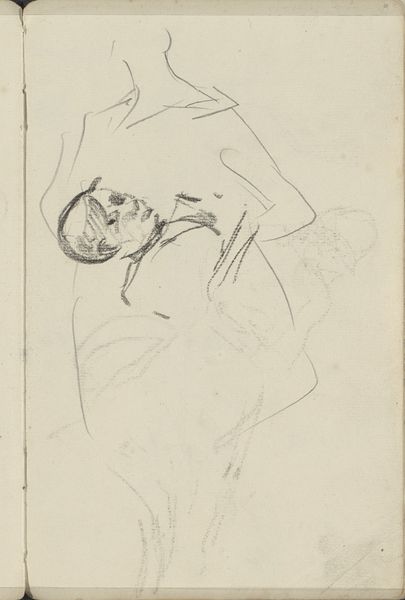 Curator: What a tender study! Cornelis Springer possibly created this pencil drawing, "Zittende vrouw," around 1869. It's currently held at the Rijksmuseum. What’s your first impression? Editor: There’s a melancholy here. The figure is isolated on the page, almost floating, as if untethered to the earth. The sketchy quality only heightens that sense of impermanence. It looks very vulnerable and honest. Curator: Yes, I sense that too. It's fascinating how Springer captures such depth with such simple means, mostly delicate light pencil work with very little inking or tonal variations. Given it’s a quick study, what might the positioning or arrangement of clothing be conveying? Editor: Well, the pose—a seated woman with a long draping dress - evokes classicism, yet the hurried, raw execution steers away from ideals of perfect rendering. The flow of fabric seems almost a deliberate distraction. She seems bundled away from prying eyes, somehow both hidden and exposed on the sketch page. Curator: The sketch almost appears as if a snapshot. Perhaps that candidness is something lost in later academic artwork? Do you see anything symbolically embedded? Editor: The turned away glance can imply inwardness, secrecy, or the avoidance of eye contact. While this work exists within academic frameworks, the sketch-like composition introduces more open psychological and spiritual depths than polished academic paintings allow. Curator: The incompleteness adds something profound, and the open sketchbook format brings immediacy. Knowing it's most likely a drawing within a personal sketchbook rather than intended as formal exhibition, does that enhance your appreciation? Editor: Absolutely. This raw expression, found only in a casual act, can be viewed almost as a portal directly into the artist’s immediate thought patterns and emotive core. It reveals art stripped bare and raw from its creator. Curator: So, in essence, its unfinished nature unveils something that complete perfection might have otherwise obscured. I agree. It's quite thought-provoking to see beyond artifice into unguarded human expression. Editor: Precisely. I walk away sensing the powerful potential latent in these unrefined forms of creation that challenge convention.