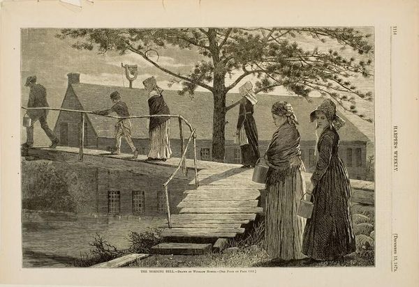 Editor: This is "Nooning," designed by Winslow Homer. It depicts children resting with their dog. I'm curious about the choice to render this scene as a print; what does that tell us? Curator: Well, this being a design emphasizes its role in mass culture. Consider Harper's Weekly, where it appeared. The means of production – engraving, printing – made this image accessible. Editor: So, it's not just about the scene itself, but about who could see it and how? Curator: Precisely! Think about the paper quality, the ink, the labor involved in distribution. These elements shaped its reception. It's not simply a snapshot; it’s a manufactured commodity. Editor: I never thought about it that way. It's fascinating to consider how the production influenced its meaning! Curator: Indeed. It transforms our understanding of art from a unique object to a manufactured product within a larger system.