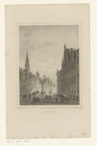 Curator: What strikes me first is the almost dreamlike quality given to a London street scene through the fine detail of this etching. Editor: And what a street! This is “View of the Royal Exchange, London,” made after 1838 by John Woods, a printed rendering of the late Royal Exchange on Cornhill. Curator: Right, there’s something very precise and even quaint about the way the artist has captured the hustle and bustle. It feels very different from a photograph. More…selective, perhaps. Editor: Indeed. In terms of its historical context, let’s consider the Royal Exchange’s role as a marketplace for global trade, deeply intertwined with Britain’s colonial past. It literally showcases a nexus of wealth accumulation. This piece raises important questions about representation, about who gets to be seen and how. The engraving seems almost celebratory, but let’s think about the stories left out, about who’s benefitting from this financial center. Curator: That’s such an interesting point. It made me think, how Woods created depth in what is such a detailed and very controlled technique—creating shadow by densely working an area, and using space in other areas. What’s there is incredibly intentional. It does invite speculation as to what else could have been depicted! Editor: Right? Whose labor built those buildings? Whose ships brought goods to be traded there? Whose land and resources made it possible? This scene exudes prosperity but the etching medium creates a very delicate impression. A prosperity that history suggests, like a thin sheet of paper, can tear very easily for many involved in its accumulation. Curator: The tower almost piercing the clouds really gives this that sense of the architecture aspiring to something beyond itself, whether earthly or divine. What I really adore are the small details of life captured; look at those people milling about the foreground as though captured at a candid, rather than staged, moment. Editor: Yes, and how do we interpret their placement? There’s certainly an argument to be made for how the arrangement of figures relates to visibility and power, suggesting the public spectacle of finance reinforces very specific social and economic hierarchies. Curator: A print like this is a document of a particular way of seeing, literally and ideologically. What it reveals about that time, and about our own ways of looking at it now is quite thought provoking. Editor: Absolutely. And how we, now, can question our own position in relation to the structures of power depicted within.