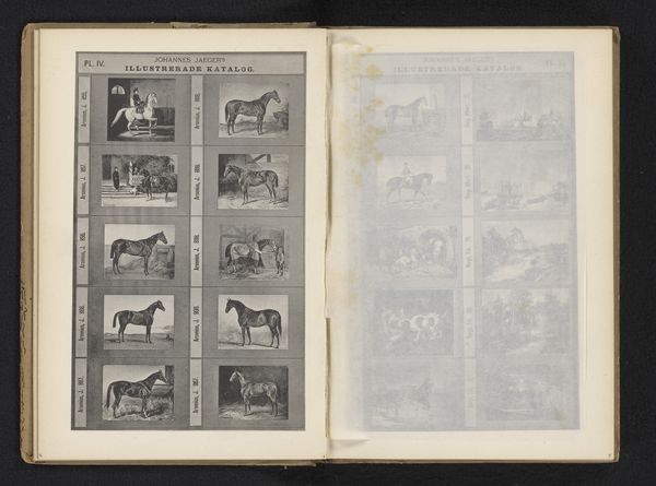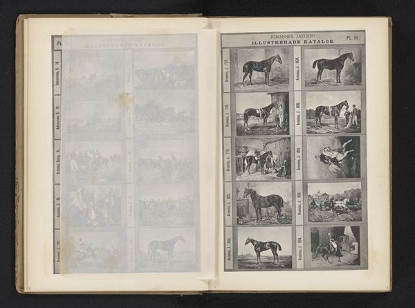Curator: This page comes from what’s titled, "Fotoreproductie van tien schilderijen van dieren" – a reproduction featuring ten paintings of animals created by Johannes Jaeger sometime between 1872 and 1882. What strikes you about it at first glance? Editor: There’s an immediate sense of domesticity. I see dogs primarily—a working-class pet of the time—in many scenarios: lounging, eating, and guarding. They're positioned very deliberately. Curator: Exactly! The dog in many ways becomes a vessel for human emotion and even moral standing, right? They often are portrayed as embodying traits desirable to us like loyalty and obedience. Notice how the dog on the upper left looks noble almost like a royal portrait, set off against the grittiness of everyday toil, reinforcing an older societal hierarchy? Editor: Yes, but to whose benefit is such devotion, such “nobility” really? These idealized roles often require sacrifice, especially for marginalized figures throughout history whose existence relies upon service to power. How do these portrayals normalize human expectation and demands? Curator: That push and pull is key. Look closely, each dog occupies this liminal space—they're companions but also, at a certain level, tools. I see here reflections on evolving human animal dynamics within industrialising societies of the era when old customs were confronting the realities of class, labour, urbanism. Editor: Agreed. And each carefully rendered pose holds significant cultural weight. For example, notice how the image showing animals at a table playing is a nod to societal behaviours; what do we glean from representing non-human life acting “civilized?" I'm interested in understanding such implied moral judgement here and, generally, within similar period pieces! Curator: Think also of these works in light of rising Darwinism and shifting perceptions around the relationship between the animal and human world at this moment. They're meant to charm viewers surely, but they stir something deeper... a reconsideration perhaps regarding place and purpose and meaning. Editor: Absolutely, and by looking closely, these layered images make us reconsider our role in upholding those definitions still. Thank you, the dialogue certainly has awakened my desire to explore the artwork at a deeper, personal level. Curator: My pleasure, it's been an enrichening examination for me, as well!