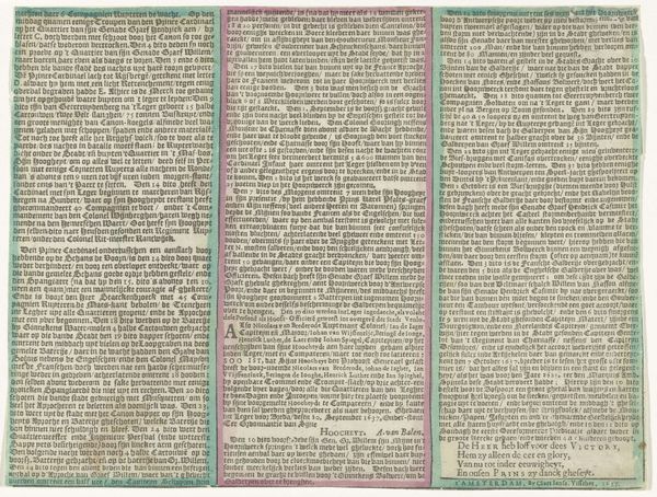 Curator: Here we have a text sheet related to the map of the siege of Breda, printed in 1637, a graphic work by Claes Jansz. Visscher. The typography feels rather dense. It reminds me of legal disclaimers one finds on the back of contracts. What strikes you? Editor: Yes, it is text-heavy, isn't it? What jumps out at me is the sheer volume of information crammed onto the page. It gives me the sense of a very detailed and, perhaps, overwhelming account of the historical event. Can you unpack the layers of historical and cultural significance for me? Curator: Of course. Looking at this piece, I see more than just a document; I see a carefully constructed piece of political communication. Consider the context: the Dutch Golden Age, a time of intense national pride, commercial expansion, and constant war with Spain. The siege of Breda was a pivotal moment, a back-and-forth struggle that gripped public imagination. Now, what does the very act of printing and distributing this sheet imply to you, considering the technology of the time? Editor: Hmm, I suppose it suggests an effort to inform a broad audience and shape public opinion. It becomes a tool for nation-building. Curator: Exactly! Print was relatively new, and images of battles served as mass media and a way to propagate political messages. Editor: This text served as propaganda that aimed to celebrate Dutch resilience and promote patriotism. How interesting. I initially thought it was dry history! Curator: See how socio-political context transformed your perspective. Art in its essence engages and informs. Is it simply conveying objective information or does it lean towards influencing the viewer? Editor: I never looked at historical events like Breda's from a viewpoint beyond simply stating who won. I'll have to read historical text with far more scrutiny from now on. Thank you. Curator: A great point; art always acts as a mirror for the people.