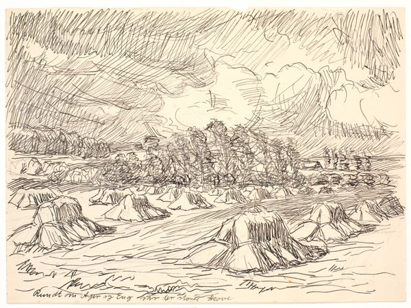 Curator: Here we have "Rundt om Ager og Eng laa store Skove," or "Around Field and Meadow Lay Large Forests" by Fritz Syberg, created in 1928. He used ink on paper for this drawing. What's your take on it? Editor: Stark! It has the raw simplicity of an old woodcut, that is all sharp edges and lines. But at the same time, so free and energetic—capturing something essential about labor and land. I’m immediately struck by how material it all feels. Curator: That's a great way to put it—"essential." You see, Syberg had such a visceral connection to the earth. The image comes alive with such a vibrant spirit—almost like looking at the landscape from a cherished memory, hazy and familiar all at once. The scratchy texture, you know, almost sings of the hard work and history baked into the fields. Editor: Precisely! The harvest laid out. It highlights how farming life dictated people's existence. How communities planned for work. The open gate almost welcomes the viewer to consider their position within this working context. Curator: I feel that he captured a sense of longing with it as well— the forests around the edges almost whispering secrets, you know? As if everything has a silent story if you are to just lend an ear and open yourself to it. Editor: And that dense tree on the left frames the whole process, from production to landscape, even hiding some details with its shade and scratchy pen strokes. He leaves room for speculation in his rural idyll! Curator: It's true, it seems the whole composition is orchestrated in that way, right? To give you that cozy sense of comfort that there's more there, just beyond what you can see. It’s wonderful how such simple materials—just ink and paper—can unlock those very complex and gentle feelings. Editor: Definitely a prime reminder that it's through physical work that land nourishes us—with both the practical resources and those quieter, deeper comforts. Curator: What a wonderful perspective—thank you for bringing that into my view. Syberg has invited us on a humble and gentle journey, don’t you agree? Editor: Exactly! I really appreciate seeing the evidence and process of material cultivation through an artist’s skilled and thoughtful interpretation.