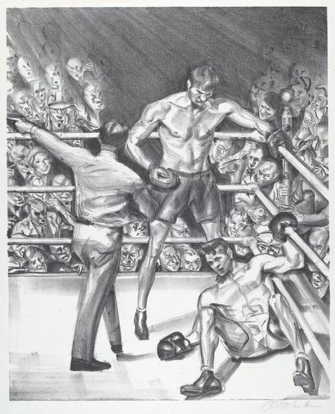 Richard Franklin Bartlett created this lithograph print, "In This Corner," using a traditional method of printmaking. The process starts with a smooth stone, upon which the artist draws an image using a greasy crayon or ink. The stone is then treated with chemicals that make the drawn areas attract oil-based ink and the undrawn areas attract water. When the stone is inked and pressed against paper, the image transfers, creating a print. It is a labor-intensive process requiring technical skill and an understanding of chemistry and materials. Here, the stark contrast between light and shadow, achieved through subtle gradations of tone, highlights the intensity of the boxing scene. The arena's ropes and the focused faces of the crowd add to the sense of enclosure and the drama unfolding within the ring. Bartlett’s lithograph acknowledges the human effort involved in both art making and boxing, reminding us of the cultural and social contexts embedded in all forms of production. It’s a powerful reminder that true appreciation comes from understanding the dedication required to produce work, whether on canvas or in the boxing ring.