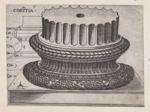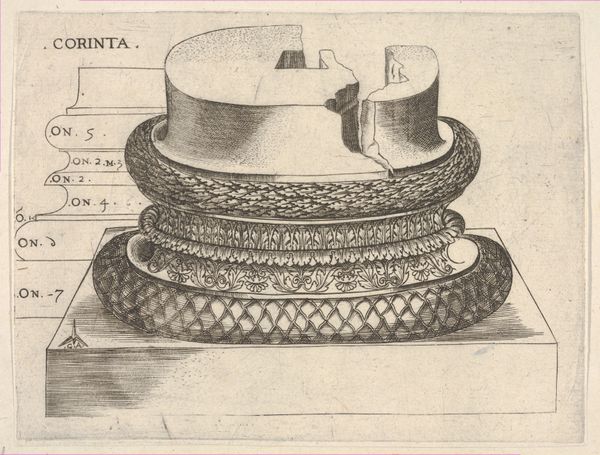 This print, “Decorated Base,” was created in 1575 or later by Monogrammist G.A. & the Caltrop. Notice how the artist meticulously renders an architectural fragment. The layered base, depicted in stark black lines against a pale background, suggests a structure of immense weight and permanence. The print embodies a tension between representation and abstraction. While the subject is a real object, the act of isolating it transforms its meaning. Each layer of the base is clearly defined, emphasizing the geometric forms and ornate decorations. The artist meticulously details each carved element, from the braided band to the floral friezes. The composition prompts a deeper consideration of architectural form and function. It’s less about depicting a specific monument, and more about dissecting the visual language of classical architecture. The use of precise lines and careful shading invites us to consider not just what is represented, but how it is represented. What does it mean to capture and preserve classical ideals through reproduction? How does the print both celebrate and dissect the past? These questions challenge us to actively interpret the interplay between form, representation, and cultural memory.
