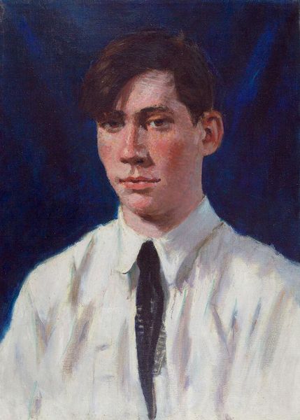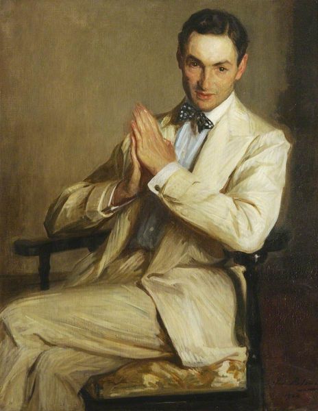 Curator: Before us hangs Zinaida Serebriakova’s oil on canvas, "Portrait of R. Ernst," painted in 1921. The subject has an intriguing presence. What are your initial thoughts? Editor: There’s a coolness to it, almost aloofness. The composition is carefully constructed, leading the eye straight to the subject's face with its somewhat piercing gaze, framed by subtle brushstrokes. There is a strong tonal contrast in play here. Curator: Indeed. Serebriakova, painting in a turbulent period of Russian history, presents us with Ernst, situated perhaps in a space indicative of intellectual life. The seemingly casual pose, almost reclining, suggests a defiance of formal conventions while still engaging with a visual language familiar to portraiture. The year it was painted, 1921, was during a time of famine in Russia and also the height of Serebriakova's artistic career prior to her eventual exile. Editor: That’s an interesting tension—the turbulent external context juxtaposed with the carefully balanced, serene composition and the very static representation of a single individual. It seems the color palette of cool reds and blues and greens creates an atmosphere of reflection. Notice the placement of his hand—it invites the viewer to contemplate this image as something of significant intellectual weight. Curator: Certainly. Consider also how his dress and accoutrements—the bow tie and what appear to be piles of papers next to him—speak to the intersection of intellect and status. His somewhat androgynous presentation challenges traditional notions of gender. And given that portraiture often functioned as a mode of social capital, we can explore questions surrounding who gets immortalized in art and the historical forces that contribute to the process. Editor: Absolutely. The artist's technique is masterful. It really holds your eye and engages the gaze despite, or maybe because of, the muted palette, creating a space for quiet observation. This encourages viewers to question the narrative of self in representation, too. Curator: A lot of factors to think about in approaching this artwork. It provides us with an access point for delving into early twentieth century understandings of gender, class, and national identity during this unique cultural period. Editor: I leave feeling aware of the image’s unique qualities and also the broader theoretical considerations, and this is the true value of art as a space to both appreciate and interpret from a wide range of personal perspectives.