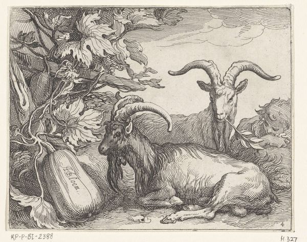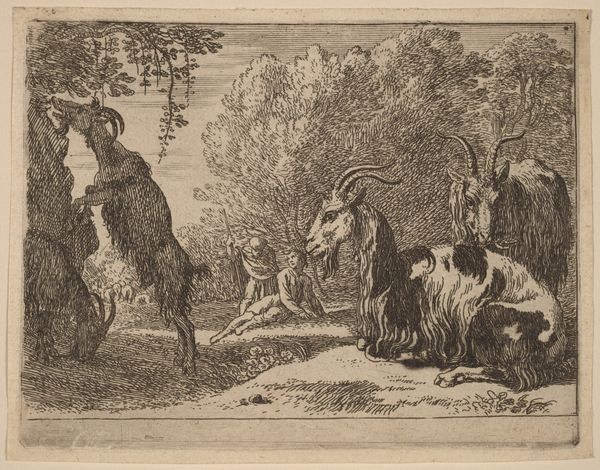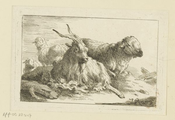 Joseph Roos created this etching, "Goat, Ram and Two Sheep," using black ink on paper. Note how Roos uses line and texture to bring a pastoral scene to life. The composition is structured around the interplay between the textures of the animals' fleece and the simple landscape that surrounds them. Look closely at the varying densities and directions of the etched lines. This technique not only defines the forms of the animals but also suggests the softness of their wool. Roos creates a complex system of signs in this seemingly simple scene. The etching doesn't merely represent animals; it also communicates ideas about nature, domesticity, and perhaps even a subtle commentary on the relationship between humans and the natural world. It is through these formal elements that Roos engages in a dialogue about our understanding and categorization of the world around us.