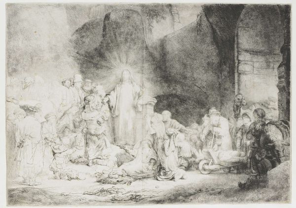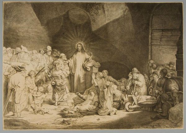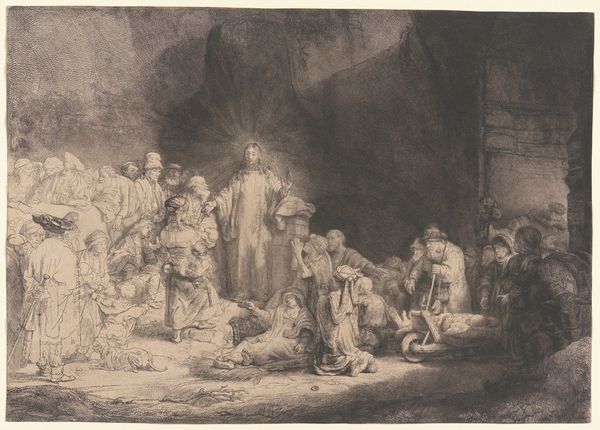 Curator: This is Rembrandt van Rijn’s etching, "The Hundred Guilder Print," residing here at the Harvard Art Museums. Editor: The immediate feeling is one of profound empathy; the figures seem bathed not just in light, but also in a shared sense of human vulnerability. Curator: Absolutely, and it is important to consider how the print gained its unusual title. Apparently, it was sold for an exceptionally high price during Rembrandt's lifetime, equivalent to a hundred guilders. Editor: It's compelling how Rembrandt's use of light and shadow creates such a stark contrast between the divine and the suffering, reflecting societal inequalities of his time. Curator: Indeed, Rembrandt consistently engaged with the socio-political dynamics of his era, often highlighting marginalized communities through religious narratives. Editor: Looking at the image now, I'm struck by how relevant these themes of compassion and social justice remain.