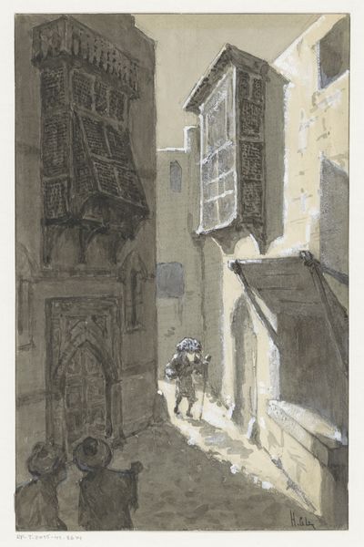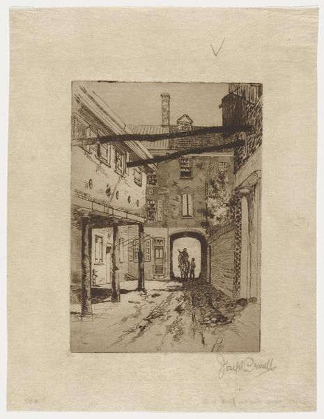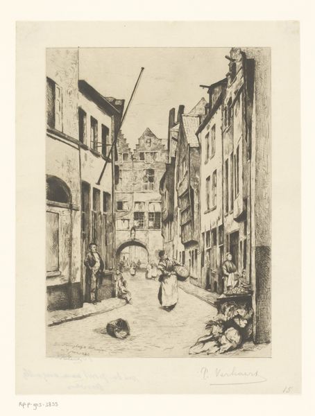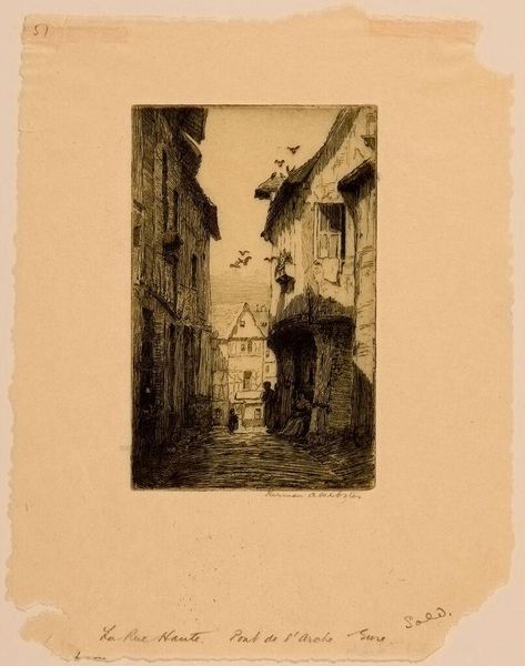 Curator: I find myself drawn to the way Herman Armour Webster captures a moment in his etching, "Rue Haute, Pont de l'Arche." Editor: It certainly feels like a fleeting observation. The composition, with those sketched studies on the left, evokes a sense of process, of the artist's hand at work. Curator: Absolutely. Webster's use of the etching process allows for a remarkable level of detail, capturing the texture of the buildings and the play of light and shadow. The materiality of the print itself speaks to a history of reproduction and distribution. Editor: But it also makes me consider who has access to the "high street" – the people and their daily lives are embedded in these very structures. Curator: A wonderful point. It encourages us to think about the accessibility of both the physical space and its representation through art. Editor: I agree. It's more than just a pretty picture, then. Curator: Exactly! It’s a visual document ripe for interpretation.