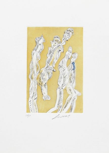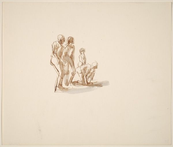 Curator: Marcel Dzama's "Untitled" presents us with a group of figures rendered in ink and watercolor, their bodies seemingly burdened by a peculiar, cloud-like form. Editor: It's captivating! The minimal palette creates a strangely unsettling mood, almost like a forgotten dream. The figures are so delicate and the cloud is so weighty. Curator: Right, Dzama's practice often engages with surreal narratives, drawing on influences from Dada and early cinema. I'm interested in how the artist uses traditional media to explore themes of labor and burden. Who bears the weight, and why? Editor: And what does that burden even represent? It’s gendered labor, clearly, and the passive gazes embedded in the cloud suggest the weight of social expectations. This work speaks to the ways women’s bodies are historically positioned as both caretakers and symbols. Curator: Indeed, considering the repetitive nature of the figures, one might even argue that it points to the mechanization of labor. Editor: It’s a powerful piece, prompting us to reflect on the roles we're assigned, the burdens we carry, and the societal expectations that shape us. Curator: I agree; it invites us to consider the materials and techniques used in relation to the social and political contexts of its creation.