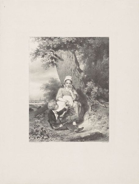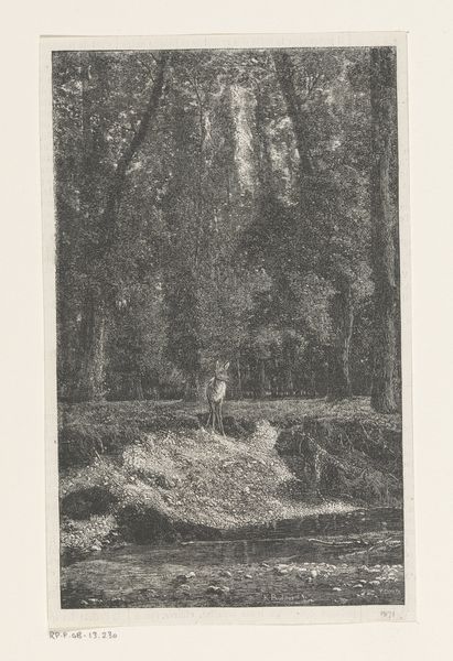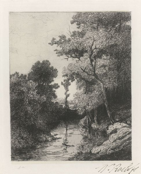 Dirk Jurriaan Sluyter made this print, "Meisje met mandje aan de waterkant," using etching techniques. The tonality, the shades of light and dark, speak to the process of etching, where acid eats away at a metal plate to hold ink. Here, the etched lines create soft contrasts, describing the scene: a girl, a basket, a stream. The very act of printing—pressing the paper against the inked plate—imparts a subtle texture to the surface. As with other prints, the work's availability made it accessible to a wider audience. Each impression carries the marks of the artist's hand and the artisan's skill. Consider the social context in which this image was created. Sluyter was working within a rapidly industrializing world, yet he chose to depict a tranquil, pastoral scene. This choice reflects a longing for simpler times and a connection to nature. The labor involved in creating this print—from preparing the plate to pulling each impression—is a testament to the value of craftsmanship in an age of mass production.