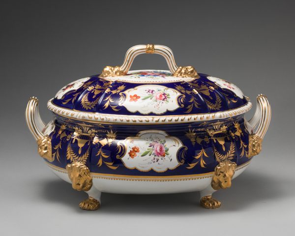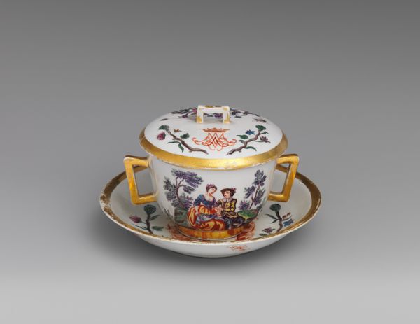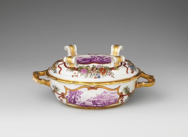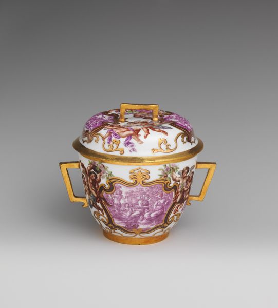Curator: Oh, that’s enchanting! It’s somehow playful and mournful at the same time. The monochromatic figures give it a cameo-like effect against that stark white porcelain. Editor: This is a covered bowl, believed to have been made between 1720 and 1730. It’s currently held at the Metropolitan Museum of Art in New York. The refined work on the porcelain body suggests its roots in the Rococo movement, with possible German origins. Curator: German, huh? Well, that explains the tiny grumpy face acting as feet! Jokes aside, the gold trim, delicate patterns—I feel like I’m peeking into someone's dreamscape from a powdered-wig movie. Is that landscape narrative typical? Editor: During this time, narrative scenes, particularly in decorative art, often echoed popular myths and idyllic themes to cater to aristocratic tastes. This piece may have been used to enhance dinner settings and functioned as a statement piece about taste, education and worldly views. The aristocracy often saw art as an extension of power and sophistication. Curator: Statement piece is right. Imagine being a guest at a fancy dinner and reaching for some candied ginger from this ornate bowl, like something out of a novel by Jane Austen. Tell me, did pieces like this often trigger a conversation around the dinner table? Was the art just decor, or was it meant to fuel witty repartee? Editor: Art in those days served multiple purposes. It entertained and displayed taste. These objects certainly sparked dialogue and even became political platforms during more tense times. Owning a bowl like this symbolized not only your wealth but your alignment with specific ideals. Curator: You are painting a marvelous picture, so thank you! The past is still resonating when we engage with these artworks today. Every viewing, whether casual or critical, layers meaning upon meaning, connecting the then to the now. It's like talking across centuries! Editor: And appreciating, too! Even with all our historical data and theories, that quiet hum of the original creative intention—that remains.