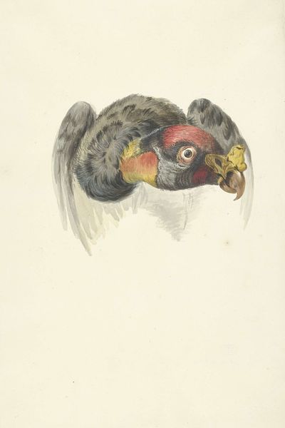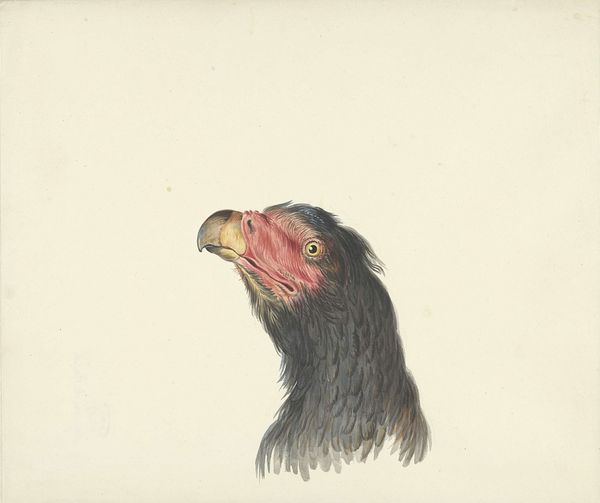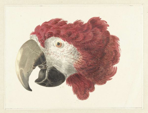 Editor: We're looking at Aert Schouman's "Head of a Cockatoo" (or Parrot, depending on who you ask!), a watercolor work from the 18th century at the Rijksmuseum. I find the detail quite stunning; there's almost a photographic quality to it. What do you see when you look at this piece? Curator: The intense gaze strikes me first. Schouman has captured something primal, almost unsettling, in the bird's eye. Consider the era – the 18th century was a period of intense exploration and classification. Exotic animals held tremendous symbolic weight. What feelings arise as you examine the bird’s expression? Editor: I hadn't thought of it that way. I see curiosity, perhaps a touch of arrogance. It definitely commands attention. The way Schouman renders each individual feather seems incredibly precise. Curator: Indeed. Each feather acts as a visual hieroglyph, speaking to Rococo ideals of naturalism blended with ornamental flair. And look at the subdued color palette. Why do you think he might have chosen to depict it in shades of grey, brown, and yellow? Editor: Maybe to emphasize the texture and form? Or perhaps the artist wished to make a symbolic statement about colonialism and its effect on natural environments, limiting or erasing their vivid beauty through appropriation? Curator: Precisely. These imported species, so carefully documented, simultaneously embodied scientific curiosity and the power dynamics of trade. There is the excitement of the new, combined with something else… do you feel it? Editor: Now that you mention it, there’s a subtle melancholic feeling, too – perhaps a loss of its origins, reduced to a specimen. I will now remember this artwork not just for the quality of the details but also for the sad narrative around colonialism. Thank you for pointing this out. Curator: Art speaks volumes about cultural values, intentions, and beliefs of a given period, provided that one reads closely its hidden signs and visual markers.