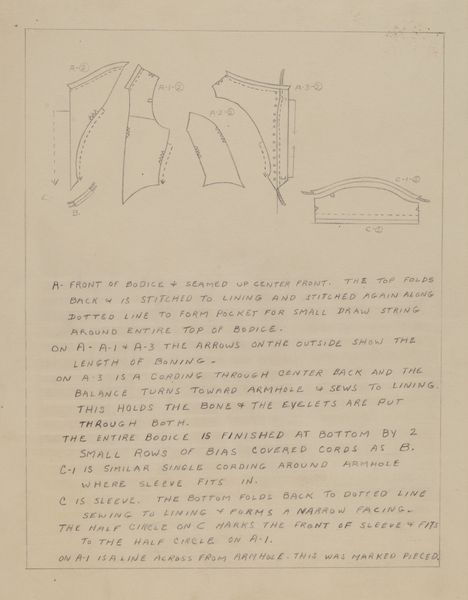 Curator: So, here we have "Dress (Pattern)" a graphite and pencil on paper drawing by Jean Peszel, around 1936. Editor: Yes, it's striking how this dress pattern drawing, seemingly utilitarian, now hangs on a gallery wall. What stands out to you in this work? Curator: I see a confluence of labor, material, and design. It challenges the traditional hierarchy separating "fine art" from the craft of dressmaking. Look at the inscription; it unveils the process of creation and how the raw material—fabric—is transformed through labor and design into a garment. Editor: Right, it is interesting to read what these small written snippets that denote production. Almost as if we are peering into the material process. Curator: Exactly. It compels us to contemplate the social and economic contexts of the 1930s. Who was the garment intended for? What were the working conditions of those producing similar dresses? Was this drawing a step in bespoke production or geared towards mass consumption? Editor: That's a crucial question. And viewing it as a drawing made from graphite and pencil, rather than a digital rendering, tells us a lot. How different it is from the patterns produced by computers these days. Curator: Absolutely! Think about the labor invested in meticulously sketching the design, lettering the annotations. It makes the process of art integral to its meaning. Editor: This approach has illuminated this simple pattern and made me realize its place in art history and material culture! Curator: I am so glad! Approaching the art from the vantage point of materials, design, and historical labor gives us a perspective on this dress pattern's hidden life.
