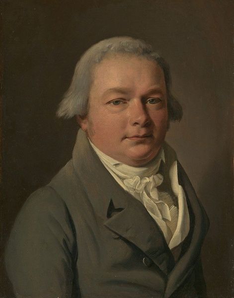 Editor: Here we have Vladimir Borovikovsky's "Portrait of Alexander Dmitrievich Arseniev," created with oil paints in 1797. I'm struck by the way light illuminates Arseniev's face. What do you make of the composition? Curator: The formal organization relies heavily on carefully controlled light and shadow. Note how the stark contrast shapes the figure, directing the viewer's eye across a relatively limited chromatic scale. It is carefully constructed with a controlled geometry that evokes tranquility, in defiance of romanticism and yet, hinting at its color pallette. Editor: Controlled geometry? I see what you mean with how balanced his face is, how the light on one side is met by shadow on the other. Curator: Precisely. And observe the materiality. The thick impasto of the face juxtaposes against the relatively smooth fabric of the coat and soft gradients in the landscape backdrop. It lends itself to a deeper expression, and anchors our reading of the symbolic weight implied by his medal. The light reflecting on its jewels underscores the compositional balance. What sort of tension does that juxtaposition create for you? Editor: I hadn't noticed that interplay of textures, but now I do! It feels like the rough texture of his face makes him more lifelike and emphasizes the smoothness and sheen of the coat. The visual tension somehow brings out the best features of both? Curator: That's insightful. Through a mastery of pictorial devices, the subject achieves almost a universal, dare I say iconic, presence. This, in turn, enhances the semiotic value and impact of his visible accoutrements. Editor: That was quite a ride into the depths of visual structure. Thank you for helping me unravel this. Curator: It has been a pleasure to closely observe the portrait together.