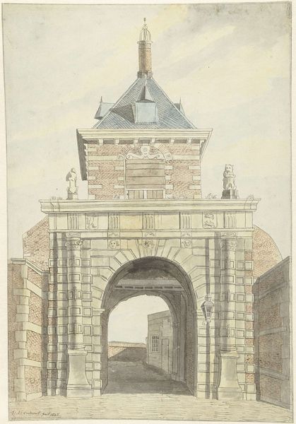 Cornelis Pronk created this drawing of the Binnenpoort in Culemborg using pen in gray ink and brush in gray wash. Pronk was a leading topographical artist during the Dutch Golden Age. This drawing captures a moment in time, but also represents the political and economic power of the Dutch Republic during the 18th century. Gateways like this one were not merely architectural features; they were potent symbols of civic identity, control, and commercial activity. Note how the tower looms over the townspeople, a stark reminder of the established order. Pronk's choice to depict the gate with such detail invites us to consider the social dynamics at play within the community. Consider who is allowed through these gates, and what the architecture tells us about the values and priorities of the society that built it. It leaves us contemplating the relationship between those in power and the everyday lives of the people who lived under its shadow.