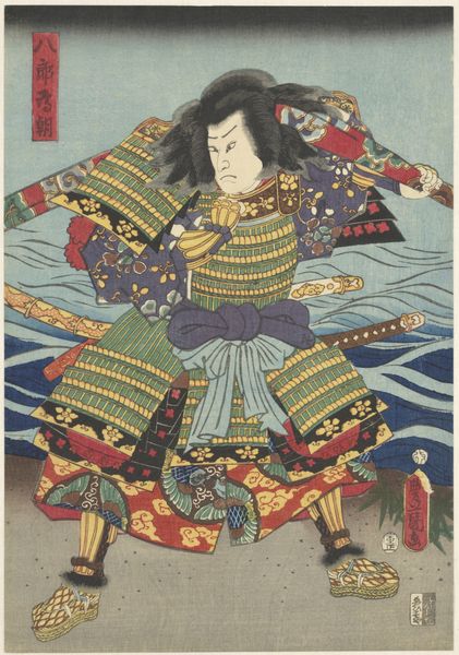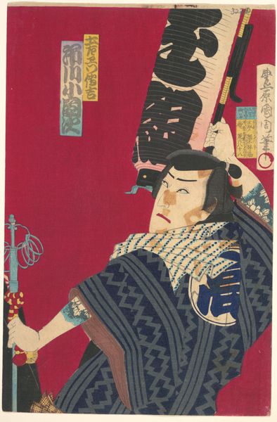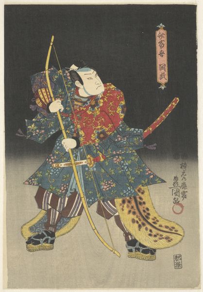Editor: This woodblock print, titled "Sutewakamaru," was created in 1863 by Utagawa Kunisada. It has such a dynamic feel! The figure almost seems to be floating on those scrolls. I'm really struck by how the patterned robes contrast with his intense expression. What historical context informs this artwork? Curator: That's a great observation. This print belongs to the Ukiyo-e tradition, "pictures of the floating world," popular during the Edo period. The patronage of the merchant class significantly shaped artistic themes during this period. Could this influence be the key to understanding Kunisada's artistic approach? Editor: Interesting... You mentioned the merchant class. In what specific ways did their patronage impact artists like Kunisada? Curator: Well, with the rise of the merchant class came new tastes and interests reflected in the art. Subjects like Kabuki actors, courtesans, and scenes from popular narratives became highly sought after, fostering the growth and public role of woodblock printing. Considering this, how might that relationship be visible in the print before us? Editor: Hmm, Sutewakamaru himself seems to be a figure from a narrative, given his theatrical costume and expression. Curator: Exactly! Prints like these allowed for stories and theatrical performances to reach a broader audience beyond the elite, thereby democratizing access to cultural narratives. Did mass distribution influence Kunisada’s selection of such dynamic subject matter for public consumption? Editor: I never thought about it that way, it seems like it made an impact on the cultural perception of Kabuki. Thinking about the composition and the fact that it's a print really brings it home for me. I'm so glad to have learned how the society around the art impacted Kunisada! Curator: Yes, considering the socio-political role that it had really shows how art affects and reflects society.