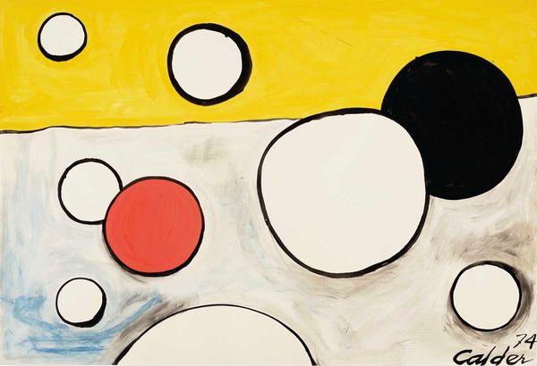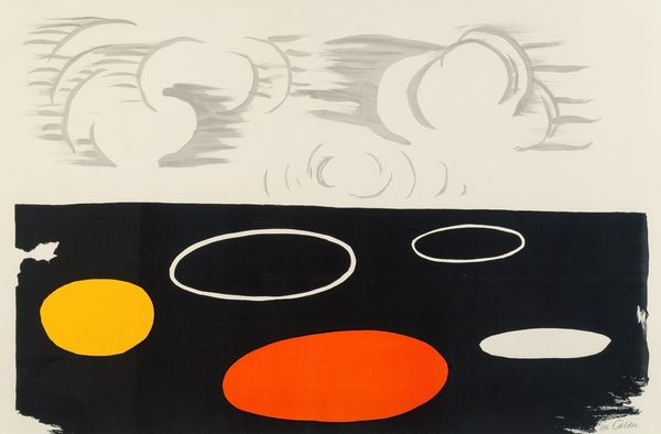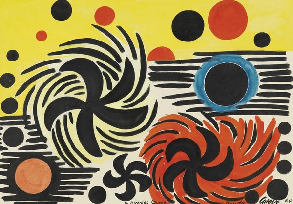 Curator: This is Alexander Calder’s "Bird’s Nest," created around 1968. It's an acrylic print that bursts with color and playful energy. Editor: My first impression is, it’s busy! All those circles and lines, the strong colors. It's almost overwhelmingly joyful. A real sensory experience. Curator: Exactly! Calder was deeply engaged with color theory and movement, and here, we see both at play. "Bird's Nest" also came about when there was great interest in pop art. The simplified shapes certainly speak to that moment in art history. Calder found fame as an artist during a time that demanded works to possess clean lines, and a polished finish. Editor: Do you think the title aligns with the abstract forms depicted in the work, though? It’s difficult to see an immediate parallel with 'Bird's Nest'. Maybe it's suggesting the chaos and vibrant energy of a nesting place, viewed from above? Curator: Perhaps, and it does evoke the post-war boom. I wonder if his intention was less literal, and more to create a feeling of natural energy and organic form through abstraction. The circles could be eggs, the lines branches... It’s a playground of visual cues. Editor: Speaking to cues, I cannot ignore the influence that Color Field painting may have had on him when constructing this. Although Calder does tend to exist within his own parameters, its hard to look at a piece like "Birds Nest" and not consider how it connects to other color-centered explorations occurring during the mid-late twentieth century. I appreciate it’s commitment to accessibility, and how this work really did pave the way for more of these experimental prints. Curator: You are so right to acknowledge this prints impact on society as a whole. To really experience this in its moment would've been fascinating. There is definitely something radical about the way it combines such bold abstraction with accessibility, reflecting a spirit of democratisation within the art world. Editor: Looking at it again, it truly captures the optimism and playful experimentation of the era. There is a raw kind of feeling here that is a lot of fun to analyze! Curator: Agreed, and "Bird’s Nest" remains a vibrant example of Calder's innovative spirit.