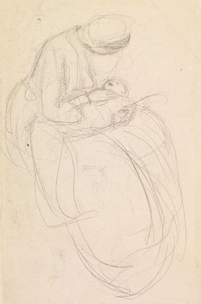 Curator: We're looking at a pencil sketch by Józef Simmler from 1858, titled 'Sketch of Catherine Jagiellon with son Sigismund and John, Grand Duke of Finland, to the painting \u2018Catherine Jagiellon in Gripsholm Prison\u2019.' Editor: It's very soft, almost dreamlike, isn't it? The delicate pencil lines create a feeling of vulnerability, particularly around the figures of the mother and child. Curator: This drawing functions as a preparatory study for Simmler’s more famous painting, which dramatically portrays Catherine Jagiellon’s imprisonment. Knowing that context shifts the feel, doesn't it? The vulnerability reads less as inherent, more as imposed. Editor: Yes, you’re right. The use of line, though, emphasizes this. The barely-there quality suggests a fleeting moment, a captured emotion more than a formal depiction of imprisonment. What can you tell us about the composition? Curator: We see Catherine embracing one child, another figure looming ethereally behind them, presumably John. The composition emphasizes Catherine’s maternal role, positioning her as a protector amid political turmoil. The original painting would dramatize this far more. Editor: I’m struck by the textural contrasts, even within the monochromatic palette. See how the shading on Catherine’s dress creates volume while the distant figure remains only vaguely defined by contours. This suggests absence but also presence. Curator: Absolutely. Remember that the finished painting served a vital political function in its time. Presenting a sympathetic view of Polish-Swedish relations was important. The original context shifts the weight and the implications here. Editor: For me, it's the emotionality conveyed through such simple means. It distills the drama of captivity down to its human core. I get that the intended political messaging is vital. Yet there's an honesty about human affect that goes far beyond historical narratives. Curator: It is compelling how Simmler manages to evoke complex emotions, like isolation and fortitude, with such light strokes. Seeing it as a step towards the larger painting helps highlight his sensitivity to character and composition, though the formal analysis sheds different lights as well. Editor: Agreed, the combined insight highlights that a mere preliminary study like this offers profound engagement with how power shapes intimate human bonds, as shown in art making practices.