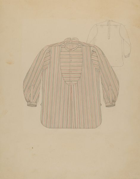 Editor: Here we have Syrena Swanson's "Man's Bolero," a pencil drawing on paper from around 1936. It's such a delicate work; the ruffles give it a playful yet somewhat theatrical feel. How do you interpret the composition and detail in this piece? Curator: The intrigue for me lies in the very overtness of the bolero. Its shape, with its cropped body and tailored sleeves, adheres to very definite compositional strategies. Note how Swanson has used repetition to structure the drawing. What do you notice about the use of line and space? Editor: I see how the ruffles are echoed across the design—collar, cuffs, hem—but the central, uncluttered space makes it less overwhelming, and allows your eye to focus on the silhouette. Curator: Precisely. The negative space around the garment delineates its form while the precise linework used for the ruffles provides textural variation. Are there any particular details of its materiality that stand out? Editor: The lightness of the pencil work. It looks so effortless, as if she knew exactly where each line needed to go, achieving so much with so little shading. It captures the essence of the bolero without getting bogged down in excessive detail. Curator: Indeed. The limited tonal range contributes to its graphic quality. The evenness of the light could be described as flattened or, less negatively, diagrammatic. This removes any drama of light or shadow from the image. Are there internal relationships between form and meaning for you here? Editor: I hadn’t considered that, but it’s as if the absence of strong shading is mirroring the garment’s theatrical nature, giving a sense of artifice, perhaps. The dialogue between line, space, and form really unlocks another layer to this drawing. Curator: Agreed, viewing this bolero as more than a design sketch gives credence to Swanson’s approach.