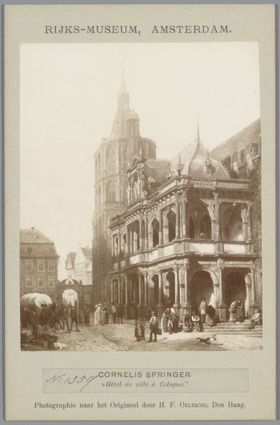 Curator: This gelatin silver print, "Exterieur van het stadhuis in Keulen", capturing the Cologne City Hall, comes to us from Anselm Schmitz, dating roughly from 1869 to 1903. Editor: It has a wonderfully ghostly feel. The light, the stark angles... it definitely speaks to a particular vision of the monumental. Almost intimidating, despite its small scale. Curator: Precisely. Consider the conditions of its production: the wet collodion process, the heavy equipment... It's easy to imagine the labor involved in transporting and preparing the plates right on site in a bustling city. Then think of the burgeoning print industry—how photographs like this circulated, shaping perceptions of Cologne. Editor: It’s fascinating to consider that this was mass media of its time. How do you think such an image, framed within "VUES DU RHIN," was perceived? What sort of politics are baked into it, celebrating Rhineland heritage perhaps? Curator: Indeed. Think about the institutional endorsement involved. The Cologne City Hall as a subject lends itself to civic pride and promotes certain values, reinforcing power dynamics through its presentation. Photography became a tool in solidifying a particular version of local identity. Editor: Yes, and one also cannot forget the broader history – this photo predates World War I and II. As the photograph aged, and history unfolded, does that not also add another layer of meaning to it? Is the beauty aesthetic? Or can a looming darkness also be appreciated? Curator: Absolutely. It also affects how the contemporary public will understand these historical photographs. In that, the act of selection is very interesting. One can never separate a piece from a time. Thank you. Editor: Agreed, a photograph always exists as a piece of history—both technological and political. It was a very fruitful discussion, thank you as well.