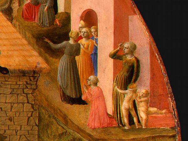 Curator: This is "St. Anthony of Padua Stilling a Storm," an illuminated tempera on vellum, painted in 1408 by the Limbourg brothers. Editor: First glance? Absolute chaos controlled with, like, the calmest demeanor ever. Is that a freaking dragon up there? It looks like something straight out of a fever dream. Curator: It’s certainly… evocative. Notice how the artists arrange the scene into distinct planes: the earthly figures listening to Saint Anthony at the bottom, the swirling storm punctuated by a rather terrifying dragon in the middle, and then the placid backdrop of green hills, offering a sense of spatial recession. The dragon likely represents evil, driven back by St. Anthony's righteousness. Editor: Righteousness and also a seriously unflappable attitude. He's just chilling there at the pulpit, one finger raised as if to say, "Yeah, dragon? What about it?" It's so wonderfully surreal. But if you focus only on composition, aren't we missing a whole other layer? It feels like a metaphor of a sort. Curator: Precisely. The overall composition, despite the literal depiction of a storm, strives to communicate an intangible harmony and moral lesson about the triumph of good over evil. It epitomizes that moment of clarity breaking through disorder, something everyone can relate to on a fundamental level. Even today! Editor: Which, I guess, makes it timeless, in a weird, medieval dragon-defeating kinda way? The use of tempera lends a soft, almost ethereal quality, which I really love. The expressions, though stylized, convey a surprising amount of emotion—awe, fear, curiosity. They have faith. Do you suppose the early renaissance aspect gives us an approach to the picture that asks, "Are these believable human interactions? Because here's what one looks like." Curator: To that I suggest, try zooming in on the faces, particularly of those gathered at St Anthony's feet, to see the degree of careful study that went into the overall composition, something you mentioned before that is undeniable for the Limbourg brothers! Their expressions do indeed draw the viewer into the unfolding miracle, grounding it in relatable human emotion. It asks us, "Where are *you* at on your faith journey?" Editor: It’s pretty amazing how much storytelling they packed into such a small piece. Thanks for drawing my attention to the early renaissance aspects as I looked to react against formalism's narrow vision and open myself more, maybe I see with slightly wiser eyes, even as the dragon watches! Curator: Absolutely. “St. Anthony of Padua Stilling a Storm” exemplifies a perfect convergence of artistic skill and spiritual depth in artwork, creating a really captivating piece even after all these centuries!