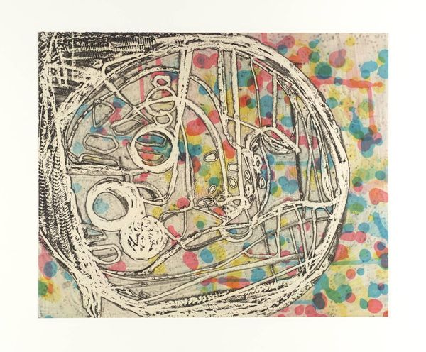 Curator: This untitled work is by Terry Winters and resides in the Tate Collections. At roughly 34 by 42 centimeters, it presents a fascinating composition. Editor: My first thought is how the shapes almost seem to float, like cells under a microscope, or perhaps colorful marbles on textured glass. The materiality seems quite tactile. Curator: Winters’ exploration of organic forms and systems aligns with a broader cultural interest in science and technology from the late 20th century. There's a social fascination here with the building blocks of life. Editor: Yes, and the way the ink is layered, almost like printmaking but with a unique handcrafted feel, suggests a tension between mass production and individual artistry. Curator: I agree, and the lack of a definitive title encourages viewers to project their own meanings onto the image, further democratizing the art experience. Editor: Indeed, contemplating the techniques used and their potential implications has truly altered my perspective. Curator: It allows us to view art's role within our society and appreciate its value.