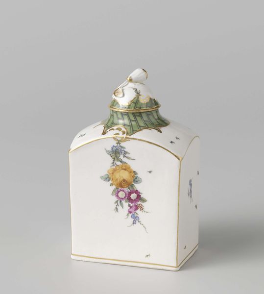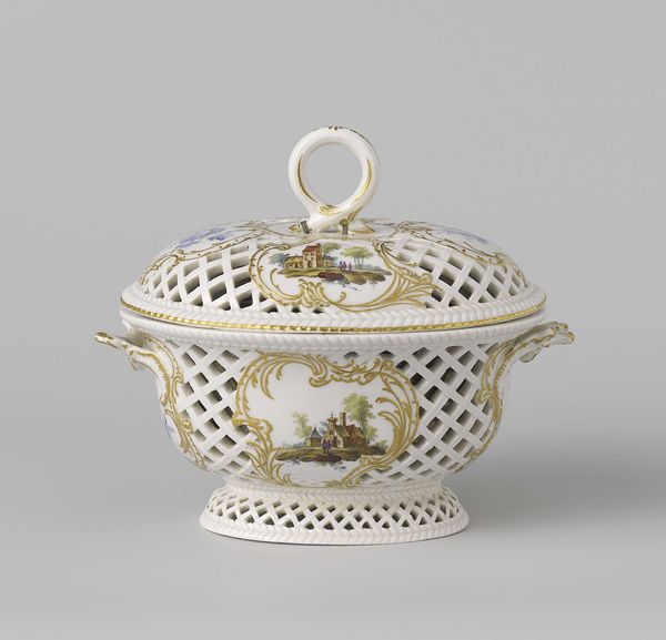 Curator: What a charming piece! This is a sugar pot with a lid, crafted from porcelain in Loosdrecht, dating back to about 1775-1778. You can see it here at the Rijksmuseum. Editor: My first impression is of delicacy and restrained opulence. The creamy white porcelain provides the perfect canvas for the Rococo floral decorations, it’s a wonderful combination of smooth surfaces and ornate design. Curator: Indeed. Loosdrecht porcelain holds a significant place in Dutch history, being among the earliest successful attempts to produce high-quality porcelain domestically. The manufactory, though short-lived, catered to a wealthy clientele eager to embrace luxury goods, which speaks volumes about the evolving consumer culture in the Netherlands at the time. Editor: The repeating ladder pattern is such a dominant aspect of this piece, acting almost like a verdant fence against the floral arrangement on the side and top. Note how the artisan juxtaposes the controlled geometry of the latticework with the free-flowing naturalism of the roses. Curator: Precisely. Floral motifs were incredibly fashionable during that era, symbolizing wealth, leisure, and refinement. Owning such an item showcased one’s taste and social standing. It’s also interesting to consider the cultural exchange involved – the secrets of porcelain production arrived in Europe from China and gradually Western artisans put their spin on it. Editor: I agree, and observe how the gold detailing elevates the design. It’s carefully used to trace the edges, enhancing definition and acting as a sort of frame to draw attention to the central composition, a visual focus reinforced by the three-dimensional floral cluster on the lid. Curator: Considering how the Loosdrecht factory was run by a clergyman, it also points to how the church also held significant financial powers in the country and was willing to participate in growing the capitalistic tendencies of the 18th century through these enterprises. Editor: Thinking about the object's function, one realizes how a simple container transforms into a vessel of status and a statement of refined living through visual and material culture. Curator: Ultimately, studying an artifact like this brings together so many social, economic, and political factors within this period. Editor: Yes, and it also invites us to examine the artistic decisions that speak to both innovation and the aesthetic principles that defined the era.