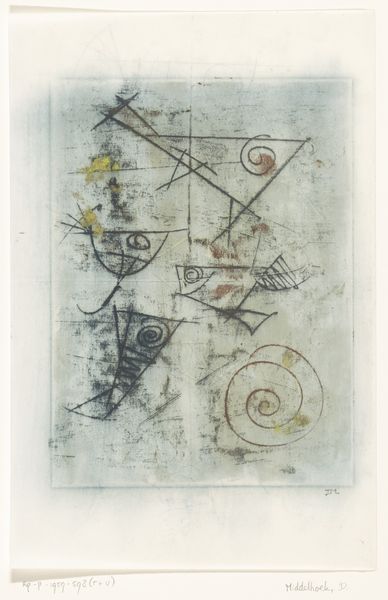 This etching by West, called "Compositie met gezicht en jockey te paard," is made using a really scratchy, almost unfinished approach, all about the feel of the line, you know? The color is pretty much not there; it's all about the tone. The marks are dry, and the lines are, too, kind of like a drawing, but with this bitten, acid-y feel to them. This is about revealing the process and the image looks like a half remembered dream. Check out the face in the middle. It's drawn with this shaky, tentative line, as if the artist wasn't quite sure what they were doing or maybe trying to work fast. It's a bit like Picasso, in that it's playing around with perspective and maybe cubism. There’s a dialogue between the artist and the work. It's about the artist having a conversation, not making a statement.