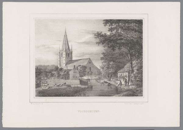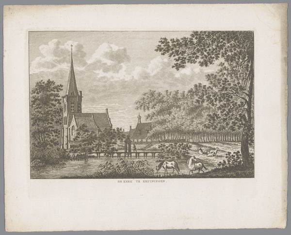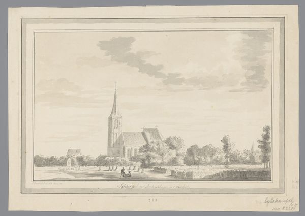 Carel Frederik Bendorp’s ‘View of the Village Sprundel near Rucphen’ is an etching with a tight composition of horizontal and vertical lines which structure the scene. Bendorp employs a structural arrangement that divides the landscape into distinct zones: the foreground with figures, the middle ground featuring buildings and trees, and the background dominated by the sky and a church spire. The textures, achieved through fine etching lines, create a subdued atmospheric quality that evokes a sense of quiet rural life. The artist uses a semiotic system of signs, where the church spire represents spiritual life, the figures signify community, and the natural elements symbolize the harmony between man and nature. These visual elements converge to reinforce traditional values of order, community, and faith. The composition's reliance on clear, rational spatial organization and subtle textural variations reflects broader artistic and philosophical concerns about humanity's relationship with the natural and social environment. This artwork challenges any fixed or singular meaning, inviting viewers to contemplate the interplay between representation, perception, and cultural values embedded within the image.
