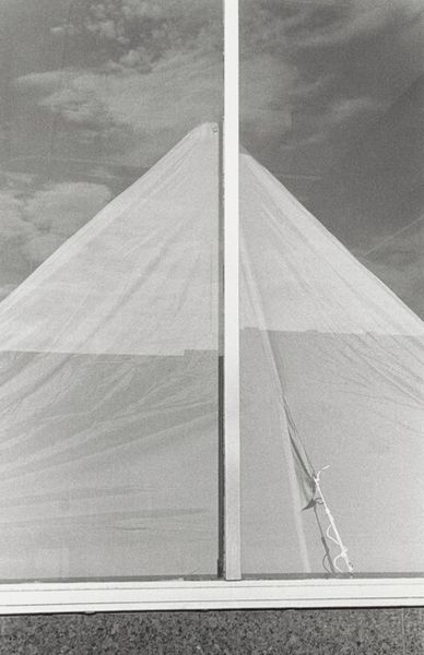 Curator: Rebecca Horn's photo, "White Body Fan," presents a figure in an almost desolate landscape, holding a large, white, fan-like structure. Editor: There’s a stark quality to this work. The high contrast and grayscale palette emphasize the geometric shapes—the curve of the fan against the angularity of the figure's body. Curator: The fan, or rather, the "body fan," acts as an extension of the self, transforming the human form into something almost architectural. It recalls ancient ceremonial objects. Editor: True, but the fan also disrupts the body, fragmenting its presence. The figure becomes almost secondary to the constructed shape, pushing toward abstraction. Curator: The binding straps on the figure's body suggest constraint, perhaps a metaphor for the limitations imposed upon the body. It makes me think about control and liberation through performance. Editor: The texture is interesting as well. The starkness of the white contrasts against the grainy background, creating a certain depth. Curator: It’s a striking piece, prompting thoughts about the body, space, and ritual. Editor: Yes, the artist uses the tension between form and content to make a lasting statement.