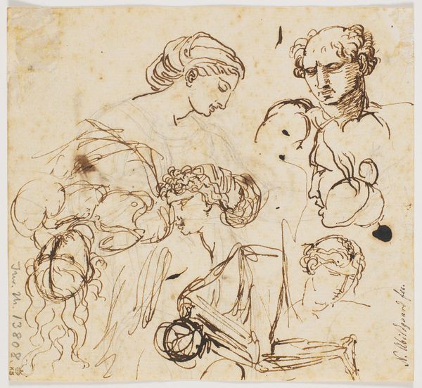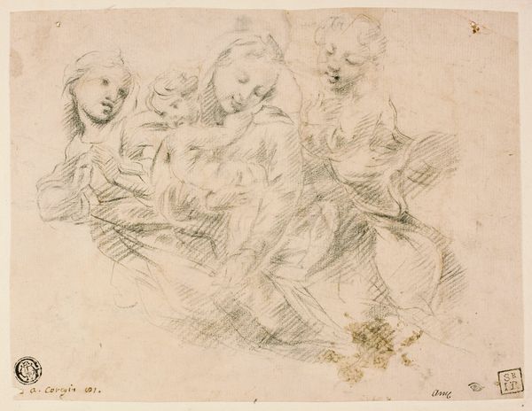 Curator: Let's consider "Marguerite Gerard Reading to Her Mother and Rosalie Fragonard," a work from around 1785 currently residing at The Art Institute of Chicago. This piece combines graphite, ink, and chalk on paper. What are your initial impressions? Editor: My eye is immediately drawn to the tonal unity. The limited palette really emphasizes the delicate play of light and shadow, creating an intimate, almost hushed atmosphere. The composition, too, with the figures clustered together, reinforces this feeling of closeness. Curator: Absolutely. Now, think about the social context. Gerard was deeply embedded in the Fragonard household; in fact, she later married Fragonard's cousin. Her access to these intimate family moments, her role as a studio assistant—all this shaped her perspective and the very creation of works like these. What materials were available, who supplied them, how Gerard positioned herself within this economy... Editor: And visually, consider the elegance in the line work, achieved through the combination of graphite, chalk and ink! The curves of the women's dresses, the detailed rendering of the eldest woman's face - notice how the artist uses hatching and cross-hatching to model form and suggest texture. There’s a structural harmony at play, a visual counterpoint between the detailed and the more loosely sketched areas. Curator: Precisely. Moreover, remember that prints were crucial for circulating images in the 18th century. The printmaking industry provided job and profit. By creating this work with graphite, ink, and chalk on paper, which would've then likely served as a study for prints, Gerard participated directly in this booming sector and found autonomy within that landscape. Editor: The expressions captured too; look at the gentle amusement on the faces of the girl and the mother, juxtaposed with the reader's focus. These subtleties evoke the sentimental narrative favored during the Rococo period. It speaks volumes about how she positions women within intellectual and domestic spaces. Curator: In essence, "Marguerite Gerard Reading to Her Mother and Rosalie Fragonard" speaks not just of aesthetic values but also reflects on broader questions about who makes art, for whom, and within what societal and material constraints. Editor: It’s remarkable how a seemingly simple composition opens up avenues for dissecting form, analyzing brushwork, and diving into thematic undercurrents. A complete art history experience.