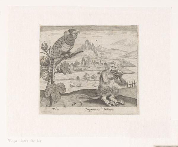 Curator: Lambertus Cornelis van der Groen created this etching, "Teef met drie jongen", sometime between 1830 and 1846. Editor: It strikes me immediately as intensely maternal, that quiet protective pose of the mother dog as her pups nurse or snuggle against her. The rendering, although in a subdued palette, is also very tactile. Curator: Genre scenes like these were increasingly popular, finding favor amongst the rising middle class. They depict the everyday rather than noble deeds of grand historical actors, reflecting a democratization of artistic taste. Editor: It is true, the image domesticates power dynamics we have become accustomed to viewing on a human scale, right? It allows access in ways images of, say, royal families do not. The viewer is not encouraged to marvel or envy. Curator: Precisely. Van der Groen's expertise with printmaking techniques like etching, created a widespread availability for such subjects and an opportunity for engagement across a wide demographic. One has to consider how distribution impacts reception. Editor: Speaking of widespread, do you think the depiction of landscape beyond the domestic act lends it more...symbolic meaning? Or am I pushing that idea? I'm referring to that hill rising behind the resting canine family; does it point toward an underlying narrative, perhaps, of nature, sustenance and nurture, survival? Curator: One might certainly argue that the natural backdrop provides commentary on the realities of motherhood. Life can be very brutal and this etching implies the need for resilience in the face of challenges. Editor: I see a stark, if muted, statement about familial protection within societal structures, captured through these common animals; perhaps more subtle commentary than some history books. Thanks for your time. Curator: A crucial element to keep in mind in all analyses! I enjoyed the discussion.