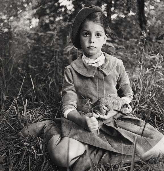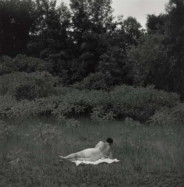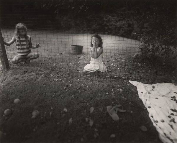 Editor: So, here we have Sally Mann's gelatin-silver print, "Jessie at 7," from 1989. There's this incredible stillness in the black and white tones. It's a portrait, but there is something unsettling about the girl's gaze that makes me uncomfortable. How do you interpret this work? Curator: Unsettling is a great word for it. Mann often plays with that tension, doesn’t she? For me, this photo is steeped in memory, not just of a child at a particular age, but of summers that stretch on forever, thick with grass and the metallic tang of something grilling nearby. Do you notice how the burger is placed so carefully? Like an offering or some clue left on the grass. Editor: Now that you mention it, the burger does feel deliberately placed. Almost staged, against the more blurry background. But there's also something quite ordinary, a fleeting moment in a casual domestic setting. The blurring does have that effect. I guess. Curator: Exactly. Mann’s work revels in that dance between the deliberate and the accidental. She is really great at presenting childhood as neither innocent nor corrupted but rather a complex tapestry woven with both. Is Jessie comfortable, awkward, performing, unaware? Yes, yes, yes and yes. A confusing symphony of everything all at once. Which is, of course, exactly what childhood is. Editor: It makes you think about the layers beneath the surface. It feels much more than a simple photograph, that's for sure. Curator: And isn't that the point, really? A photograph, or any artwork for that matter, is never just about what’s immediately visible, but all the things it invites us to imagine, to question, to remember. And the light of course. That is perfect, almost golden-hour style. Very evocative of the South, somehow. Editor: Well, that definitely changed my perspective! It's amazing how one image can hold so many layers. Curator: Indeed. It reminds me that art isn’t so much about answers as it is about enriching our way of seeing and wondering.