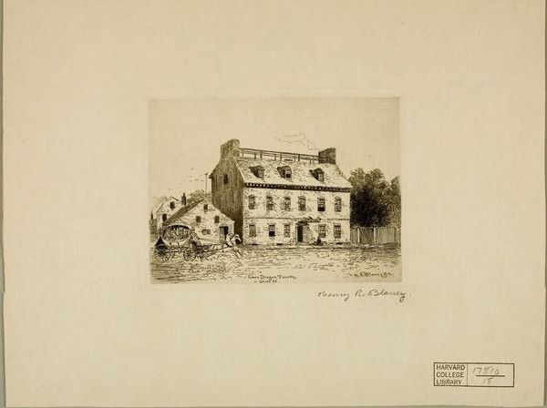 Curator: Gurdon Saltonstall Howe's print, simply titled "House," presents a fascinating study in etched lines. Editor: It feels so…fragile. Almost like a memory fading at the edges. That central tree, though, strikes a more assertive note. Curator: Indeed. The layering of hatching and cross-hatching defines the form of the house, giving it volume and depth, while the bare tree adds an element of structural contrast. Editor: To me, trees often represent life, growth, family. It seems to guard the secrets within the house, doesn't it? Perhaps family stories, whispered through generations. Curator: A compelling interpretation. One might also read its starkness against the symmetry of the house as a commentary on the tension between natural and constructed forms. Editor: Well, either way, Howe certainly captured the stillness, the soul, of a particular place. Curator: Precisely. The very essence of a house distilled to its core elements.