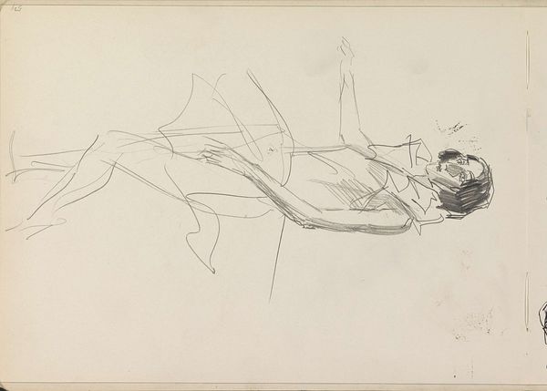 Curator: This unassuming pencil sketch from the collection of the Rijksmuseum, titled "Man met een stok of vishengel in de hand," which translates to "Man with a stick or fishing rod in his hand", likely comes from somewhere between 1865 and 1913. The artist is unknown, but this fleeting impression of a figure tells us a lot about seeing and being seen. Editor: Immediately, I'm struck by how ephemeral it feels. It's barely there, like a half-remembered dream. And the title feels similarly tentative; he might be fishing, he might just be holding a stick, who can say? There’s an honesty there, though, a refusal to overstate. Curator: The ambiguity is so rich! The stick or rod pierces through the image, literally dividing it. Perhaps that uncertainty about the man’s activity is the point. It draws us into considering what labor and leisure meant at this time. The pole is almost like a vertical, iconic staff that denotes dignity in simplicity. Editor: I think that’s key. There’s something deeply archetypal here. Consider how rods and staffs are recurring motifs throughout mythology and folklore—symbols of power, guidance, and transition. Could this be about more than just fishing or idle wandering? Perhaps it’s about finding your place, feeling the ground under your feet. Curator: It’s compelling to think of it as less a portrait and more a distillation of a state of mind, even one familiar to our own. Look at how the pencil work, though delicate, uses slight tonal variation, that almost ghostlike doubling of lines gives the figure weight, making him somehow more substantial despite the incompleteness of the piece. It’s the difference between rendering a subject and evoking it. Editor: Absolutely. The very rawness of the technique pulls us in. It feels unmediated, authentic, straight from the artist's mind onto paper. It invites us to complete the picture, to participate in the act of creation itself. The man might be incomplete on paper, but it serves to represent every man in some capacity. Curator: In its simplicity, I think the sketch becomes a vessel for all sorts of reflections on our own transitory place in the world, the inherent, incomplete nature of being. Editor: Agreed. It reminds us that we, too, are sketches in progress, still being defined by our actions and aspirations, not necessarily by our labels or what someone might see when looking at us. It is so much about human potential.