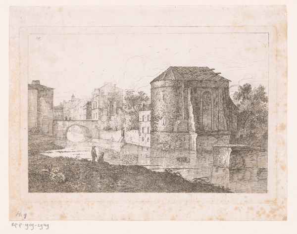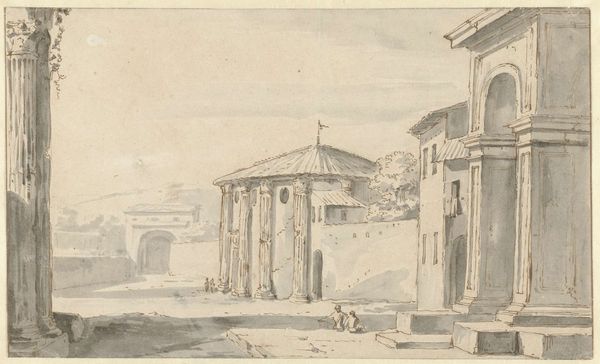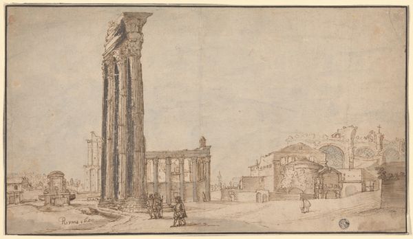 Editor: This is Jan Asselijn’s “View of the Capitoline Hill in Rome, Seen from the East,” created around 1636 to 1640, using ink and pencil. It feels almost like a ghost of Rome, a faded memory. What do you see in this piece? Curator: I see a powerful visual statement about the layered nature of history and power. Asselijn, a Dutch artist working in Italy, captures not just the Capitoline Hill but the very essence of Rome as a palimpsest. The classical ruins, juxtaposed against the contemporary architecture, hint at the ways dominant cultures build upon and often erase previous ones. Editor: So the placement of old and new speaks to a cycle of power? Curator: Exactly. And it raises questions: Whose history is being told, and whose is being omitted? Consider the cow in the foreground – an almost pastoral, genre-like addition – does it inadvertently naturalize the inequality of land usage, of access to resources, and the displacement that came with urban development? How does it contribute to a vision of progress and whose progress is being depicted? Editor: I hadn't considered the cow's placement like that before. It seems peaceful but has the potential to make a bigger political statement about resources? Curator: Precisely. Even seemingly benign details like that force us to consider whose narratives are centered and normalized, especially considering that artistic patronage at the time, in places such as Rome, served as validation for Papal or other imperial powers. Editor: This is very different from the typical art history I’ve learned, thank you. It’s shown me how to bring fresh considerations to classic works. Curator: Indeed. It shows that there's so much more beneath the surface that opens up when you interrogate the artwork through many lenses!