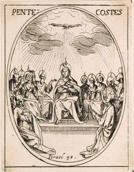 Editor: Here we have Jacques Callot's "Triumph of the Virgin," a small engraving. It's quite dramatic, depicting the Virgin Mary overcoming demons. What can you tell me about the socio-political context of this image? Curator: Callot produced this during a period of intense religious conflict. Images like these, widely distributed, reinforced the Catholic Church's power and message, visually asserting dominance over perceived heretical forces. Notice how the Virgin is literally elevated above the chaos. Editor: So, it's visual propaganda, in a way? Curator: Exactly. It uses symbolism and dramatic composition to solidify a specific religious and political viewpoint. Think about the role of art in shaping public opinion at the time. Editor: That's a powerful way to look at it. I'll never see religious art the same way again! Curator: Indeed, art often serves a purpose beyond aesthetics.