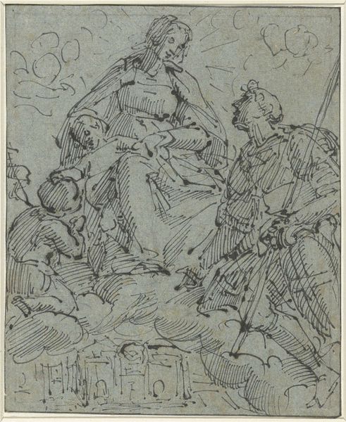 Curator: Charles Parrocel, born in 1688, captured this scene, "Infantry Leader Receiving Battle Instructions from a Cavalry Officer," in what looks to me like a very urgent moment. Editor: The figures are indeed in a state of crisis. I am immediately drawn to the militaristic culture of the day, the violence, and the historical narrative of these power dynamics. Curator: It's just a drawing, but I can almost hear the snorting of the horses and the hushed commands. The artist's hand really brings the tension to life. It feels so immediate, a fleeting glimpse. Editor: The staging does feel very Baroque. The composition hints at the rigid hierarchies inherent in military structures and the complex dance of authority. Curator: Oh, absolutely! But there’s a touch of the theatrical here, too. The figures almost seem like actors on a stage. A silent play, if you will. Editor: Indeed, the drawing prompts us to question the glorification of war and its human toll. Even in this preparatory work, Parrocel's commentary on power structures is palpable. Curator: I find myself moved by the delicacy of the strokes and the very human element. There’s a real sense of vulnerability despite all the armor and aggression. Editor: The sketch opens an important discussion on the ways military campaigns have shaped identities, social structures, and the narratives we tell about ourselves. Curator: Yes. It's a moment frozen in time, but it resonates so vividly today. Editor: A piece that reminds us that art is always in conversation with history and ourselves.