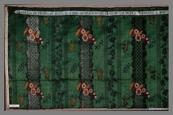 Curator: Here we have “Length,” a mixed-media print from between 1809 and 1819 by Demarne, now residing here at the Metropolitan Museum. It exemplifies decorative art from that period. Editor: Wow, that color just pops! It feels warm and rustic, like a sun-faded tapestry you’d find in a cozy farmhouse. The little scenes woven through... what's going on there? Curator: These recurring figures within idealized landscapes speak to the romanticism prevalent then, recalling genre paintings. Considering this period, we might also examine its production—the printing processes, the workforce involved in creating this popular design. Was it intended for clothing, upholstery, wall coverings? The intended usage affects the piece's status and meaning. Editor: I am curious about Demarne’s intentions, his headspace when he created this world! Did he aim for nostalgia, creating idyllic escapism from the rising industrial era? Look at the cows! Is it a symbol of simpler days, pre-factory existence, viewed from the other side? It feels like longing translated to print. Curator: Precisely. And understanding its cultural significance necessitates thinking about production—how widely distributed, for which class, at what cost, to see how the yearning for simpler days you describe gets mass-produced and consumed. The material conditions of artistic production are always important to note. Editor: You bring an interesting counterpoint to Demarne’s inspiration—he probably wasn’t fretting over socio-economic conditions. To me, the repetition almost makes it surreal—little perfect worlds cloned repeatedly. I’m getting a folk tale-meets-proto-Warhol vibe! It whispers something intimate, then repeats the whisper, until you understand that is meant for everyone, everywhere, to bring them comfort and inspire hope. Curator: Absolutely! And viewing it now, disentangled from its initial material reality, we can reflect on its value and implications—on its endurance—given current material conditions, too! Editor: Looking at it now, I almost feel compelled to wrap myself in it, to lose myself in Demarne's dream and find something beautiful about escaping to the past while embracing this moment! Curator: A tactile reaction indeed! It exemplifies that the act of consumption becomes intertwined with artistic evaluation.