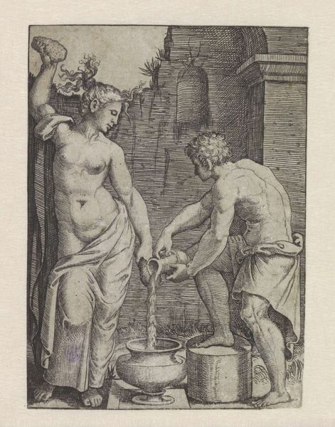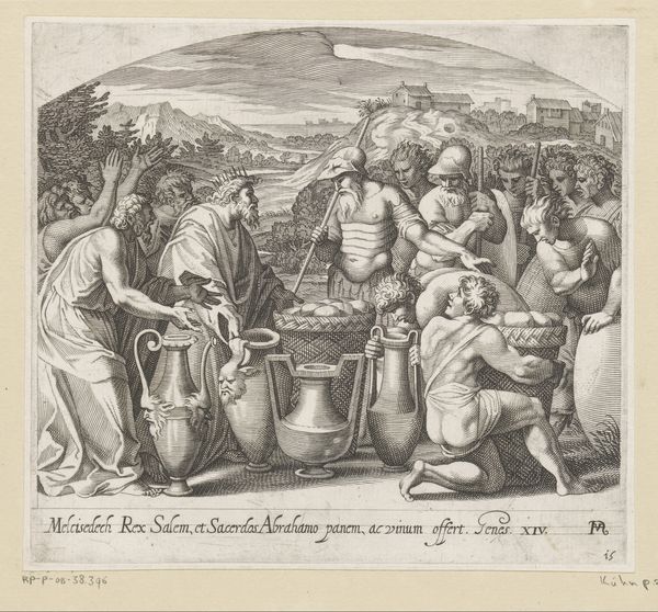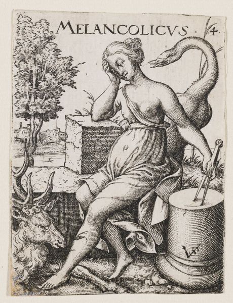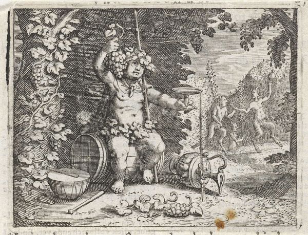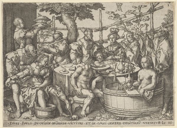 Curator: Let's turn our attention to "Bon Temps" by Pierre Brebiette. Created sometime between 1610 and 1642, this etching and engraving resides here at The Metropolitan Museum of Art. What are your first thoughts? Editor: Well, I immediately notice the composition. It’s overflowing with figures and objects; a slightly chaotic celebration, rendered in intricate lines. There's a definite sense of revelry, but also, perhaps, of impending… excess? Curator: Excess is key here! Look at the density of the hatching and cross-hatching. The artist's labor in creating this print seems to mirror the abundance depicted. He’s working with etching and engraving tools, manipulating the metal plate to produce this sense of rich texture. And consider the implications of producing it as a print. The work is made to be reproduced and widely distributed, amplifying its commentary about 'good times' to a larger audience. Editor: Exactly. And it's a very loaded image. We see what appears to be a depiction of Bacchus, or perhaps Silenus, crowned with grapes, a vessel of wine at the ready. The figures surrounding him – women, putti playing musical instruments – create this aura of pleasure and indulgence. I’m interested in the lute, how the woman looks, the expression in her eyes while playing this instrument. What this allegory attempts to portray! Curator: Musical instruments tie directly into questions of labor and patronage. Instruments like the lute were highly prized objects, products of specialized craft. Their presence here suggests both aristocratic leisure and the consumption habits that support these skilled artisans. "Bon Temps" isn't just about 'good times'; it is also subtly showing the infrastructure of production. Editor: That’s interesting. I see the symbolic dimension as dominant here, with the lute embodying harmony, not merely an aesthetic item linked to class but as part of the complete representation of good times. Also, I can't overlook that this is a rather explicitly sensual scene – the nude figures, the overflowing wine, even the close arrangements, all hinting to ideas around beauty standards of its time. Curator: But think of the economics involved in sustaining such lavish imagery. The artist depended on buyers, who in turn were benefiting from social and economic structures of the period. How complicit, perhaps, were people like Brebiette in the conditions he depicted? Editor: That brings an unexpected, new point of view into my understanding. So the scene’s joviality perhaps veils a deeper inquiry into luxury's cost! Fascinating! Curator: Precisely. "Bon Temps," viewed materially, provides a lens through which we can examine systems of production and exchange. It is through the creation of these works that we have material culture but is not simply an allegorical representation! Editor: Well, thanks to you, this print provides even richer levels to experience how symbols can still talk to audiences throughout art’s fascinating continuum.
