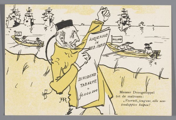 Editor: Here we have W.W. Denslow’s 1898 print, "The Philistine: 'Books to Burn.'" The image shows a figure gleefully setting books ablaze. The flames almost look like they're devouring knowledge itself! How do you interpret this work? Curator: Well, this piece throws us right into a historical moment of intense cultural debate. The late 19th century saw the rise of both literary experimentation and conservative backlash. Denslow, known for his work in children's literature like The Wonderful Wizard of Oz, uses caricature here to critique—or perhaps satirize—the conflict between artistic expression and societal norms. Consider the title itself, "The Philistine." Who are the philistines in this scenario, and what values are they defending? Editor: So, burning books represents a rejection of new ideas, or a fear of them? Curator: Precisely. But it’s not as simple as “anti-intellectualism.” We need to ask *why* these ideas were perceived as threatening. Were they challenging established power structures? Religious dogma? Social conventions? What happens when certain voices and narratives are deemed dangerous enough to be silenced or destroyed? And does this image valorize or critique the burning of books? Editor: I guess I hadn't thought about who gets to decide what's "dangerous." That makes the image way more complicated. Curator: Exactly! Denslow’s print invites us to consider how cultural anxieties shape censorship and the suppression of dissenting voices, which is as relevant today as it was in 1898. Art serves as an enduring document of those struggles. Editor: I never would have seen all those layers just looking at it on my own. Thanks! Curator: And thank you for reminding us that art isn’t created in a vacuum. Its power lies in its ability to spark these critical conversations.