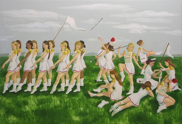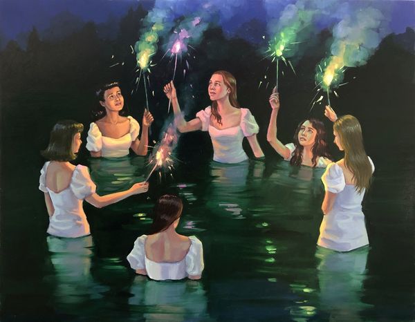 Zoe Hawk conjures an air of disquiet in 'The Grand Howl' with her masterful handling of color. The candy-pink dresses, set against the dusk sky, feel synthetic, a visual trick that hints at something unsettling beneath the surface. It's as if the painting is slowly revealing a secret. The surface of 'The Grand Howl' is smooth and dreamlike. Look closely at the fire—each flickering flame, rendered with delicate precision, casts a glow on the figures and the stones around it. Note the almost hypnotic repetition of forms, the way the girls are posed, echo one another. These gestures, rendered with a careful hand, create a sense of ritual and repetition. I'm reminded of Paula Rego, who also explores the hidden darkness within seemingly innocent scenes, but here, Hawk brings a distinctly contemporary and unnerving perspective to the tradition. Hawk seems to ask, can art be a mirror reflecting our own buried anxieties?