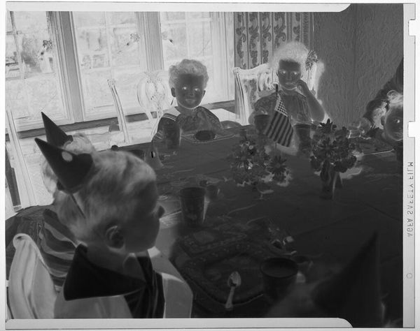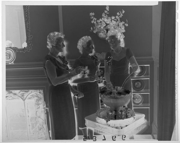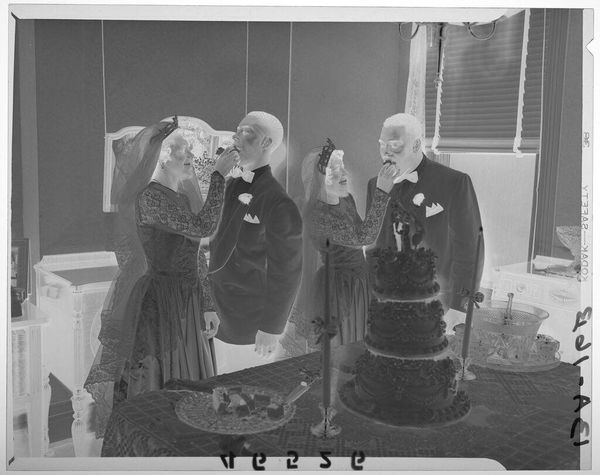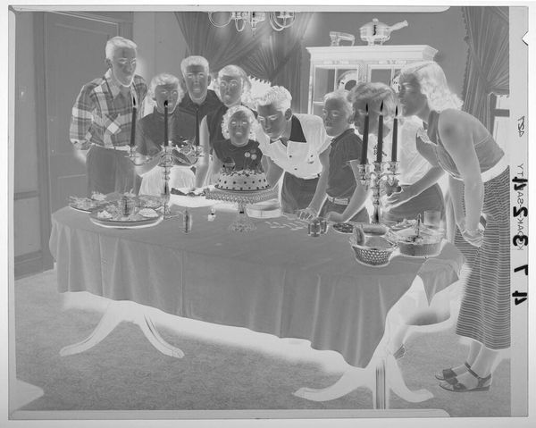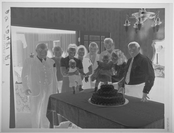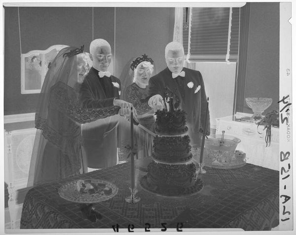 Editor: Here we have an intriguing image by Martin Schweig, simply titled "Untitled (old couple standing for toast at banquet table for anniversary party)." It appears to be a photograph, and the mood feels both celebratory and slightly melancholic. What do you see in this piece? Curator: Ah, what a delightful slice of life! The inverted tones give it a spectral, dreamlike quality, don't they? I am struck by the cake, a miniature architectural marvel, and all of these faces, aglow with memory. Makes you wonder about their stories, doesn't it? What do you think they might be toasting? Editor: Perhaps to enduring love? It's fascinating how the negative space makes us focus on the fleeting moment. Curator: Indeed. It's like Schweig is reminding us that even celebrations fade, but the photograph—like art— preserves a ghost of that joy. A little bittersweet symphony for the eyes.